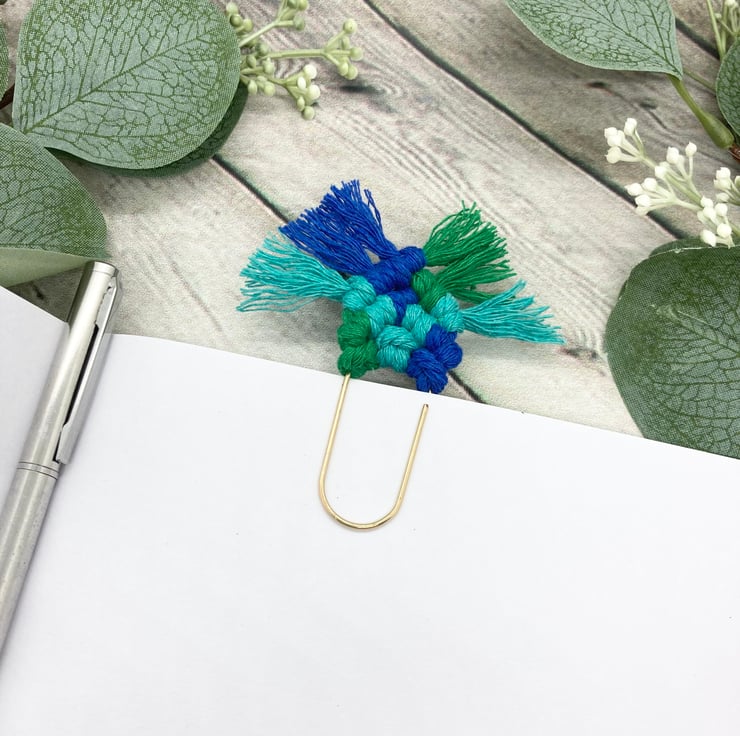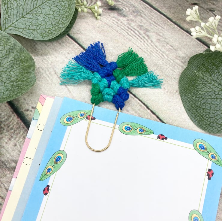 This handmade Macrame Paper Clip has been made from 100% (3mm) natural cotton cord in a range of peacock green and blue colours.