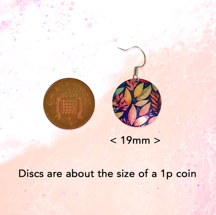 I have handmade the discs and artwork for these earrings, and the drops have a soft pink, yellow and blue leaf design, An ideal gift for someone who loves unusual jewellery. A matching pendant is available.