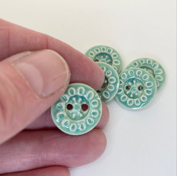This set of five pottery buttons are made from white earthenware clay, embossed and glazed on the front. They are then fired to 1100 degrees, so nice and strong. They measure 1.8cm across. They can be handwashed or machine washed on a low temperature. Perfect for all sorts of arts and craft projects