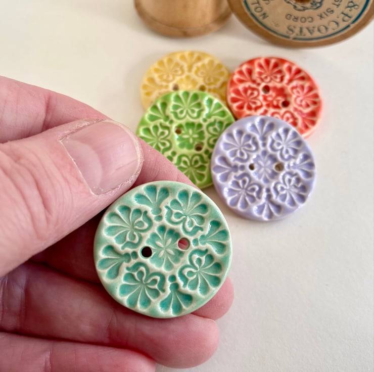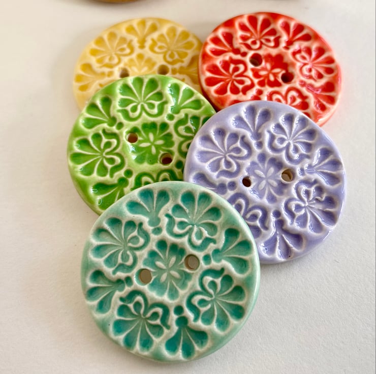This set of five pottery buttons are made from white earthenware clay, embossed and glazed on the front. They are then fired to 1100 degrees, so nice and strong. They measure 2.8cm diameter. They can be handwashed or machine washed on a low temperature. Perfect for all sorts of arts and craft projects.