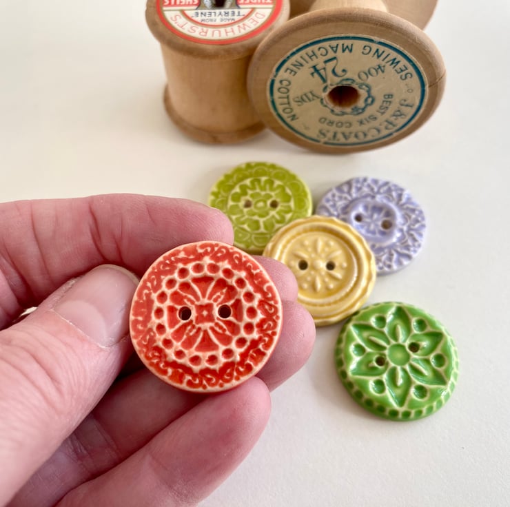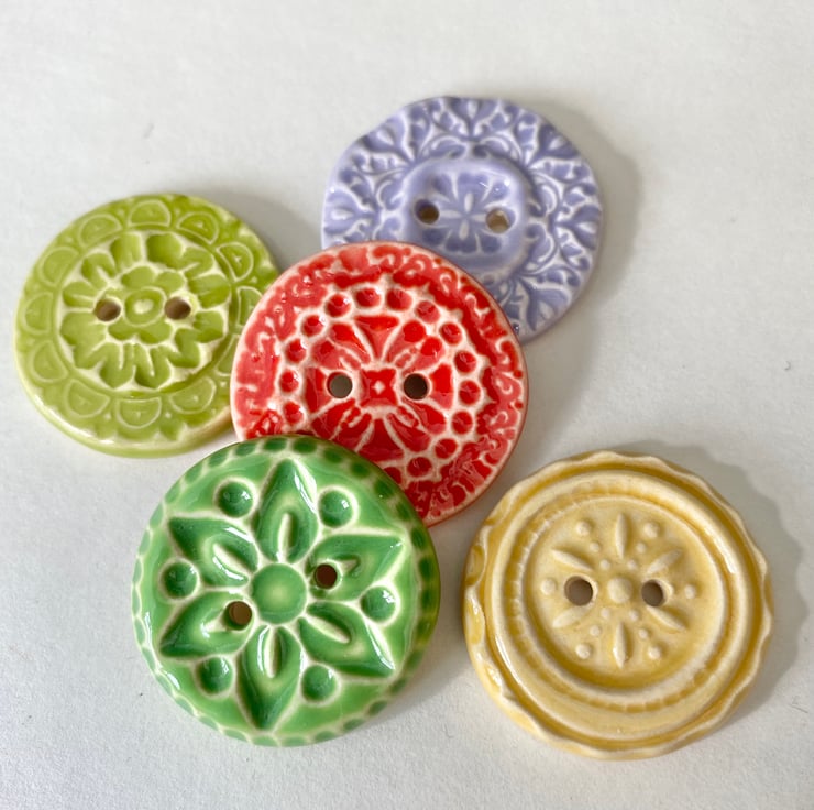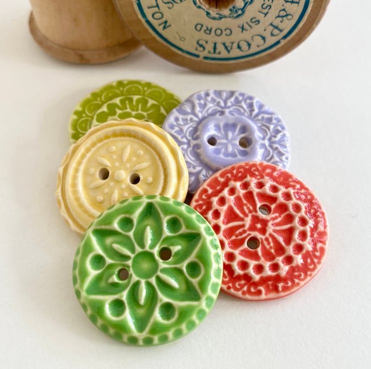 This set of five pottery buttons are made from white earthenware clay, embossed and glazed on the front. They are then fired to 1100 degrees, so nice and strong. They measure 2.8cm diameter. They can be handwashed or machine washed on a low temperature. Perfect for all sorts of arts and craft projects.