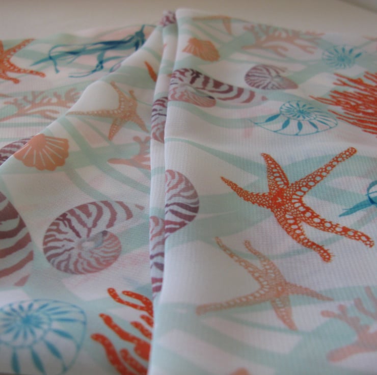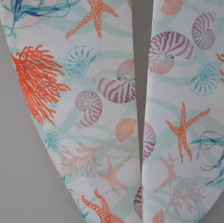 Lightweight chiffon infinity scarf featuring shells, seaweed and starfish on an ivory background. The perfect accessory for bright and breezy days at the coast. Can be worn as a single or double loop.