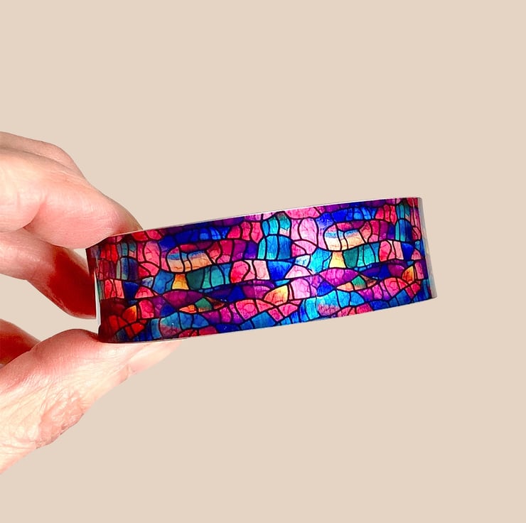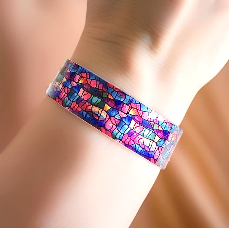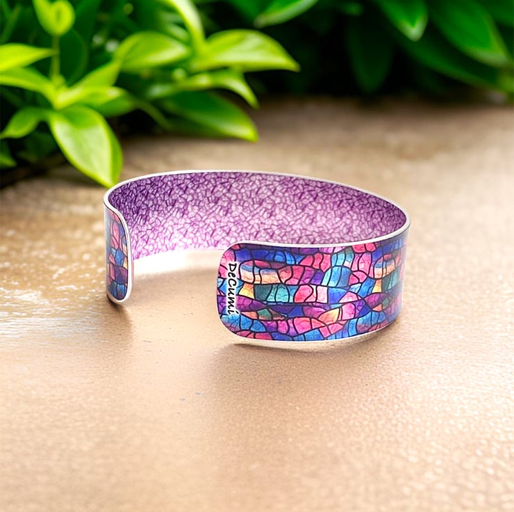 This is a cuff bracelet which I have handmade with an abstract design. Artistic with versatile magenta pink and blue colours. This bracelet can be engraved with a personal message on the reverse for a small extra fee (Optional). Matching earrings and pendant are available.