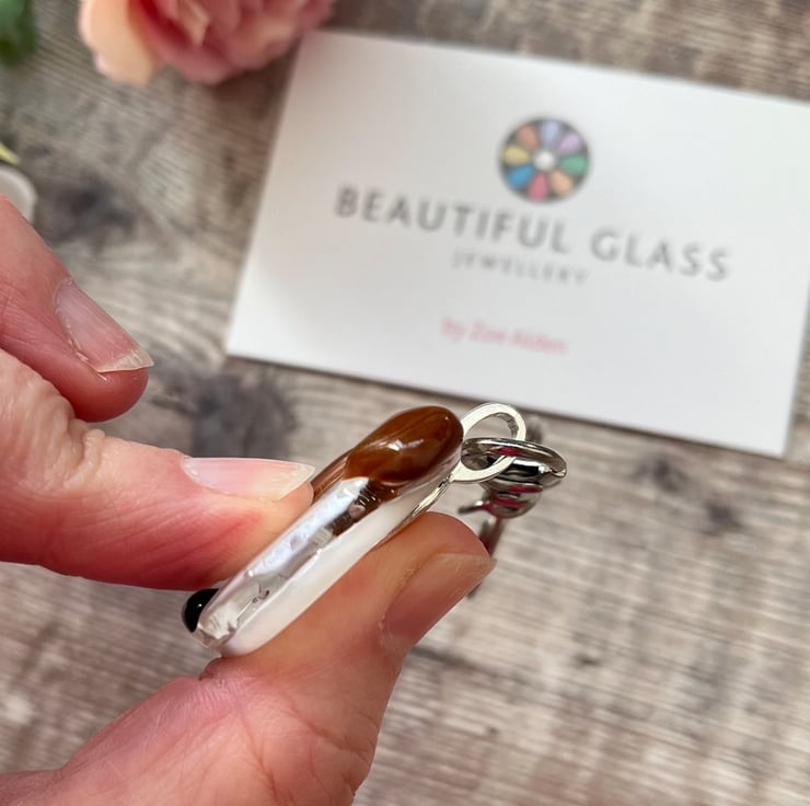 Made with pieces of white glass fused together at high temperatures, giving a lovely smooth finish. It measures approximately 2.5cm x 3cm and comes on a silver plated bail with a split ring and a keyring trigger.