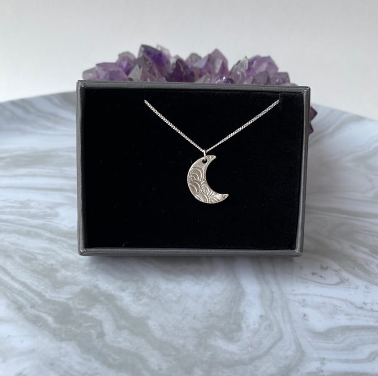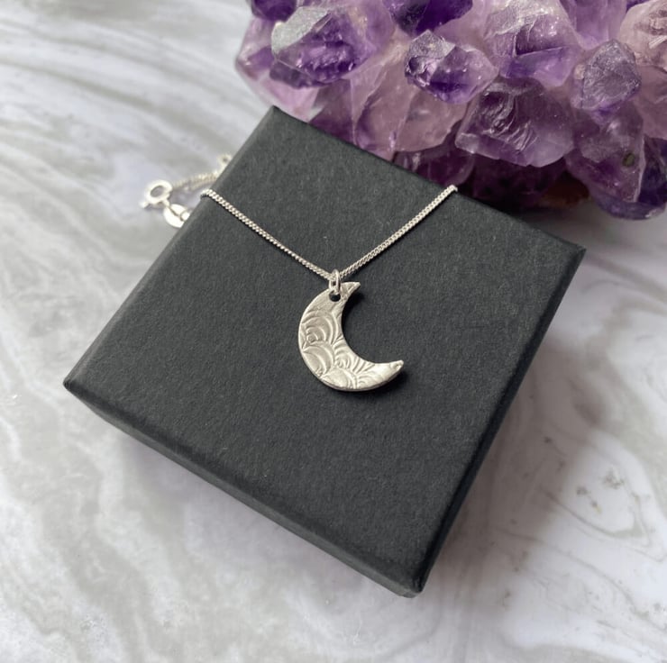 With the mini moon pendant I have created a smooth textured surface pattern to add interest to the finished look. The pendant has been smoothed and burnished for the most amazing shine. This is a lovely dainty item of jewellery that feels lovely when worn and will add a subtle hint of an almost ethereal and other worldly feel to the necklace.