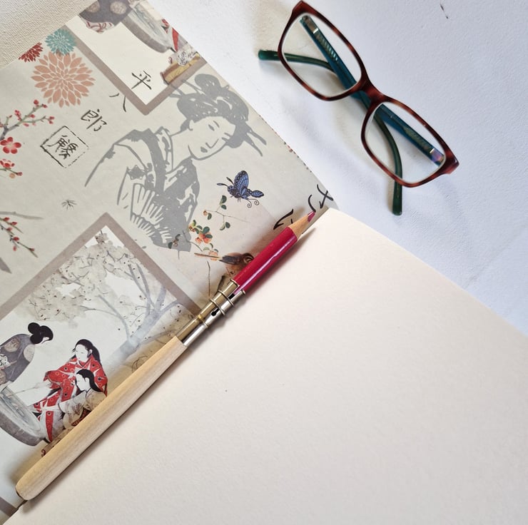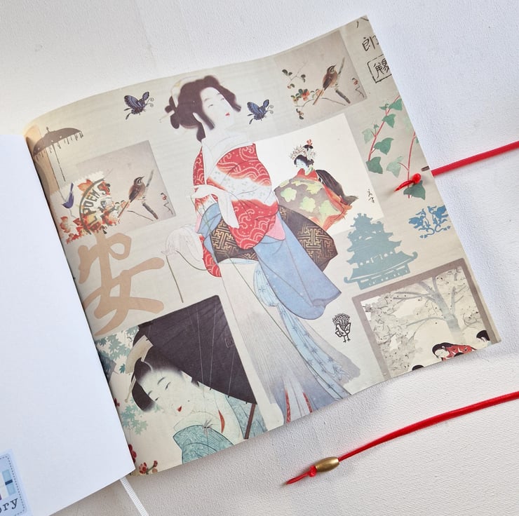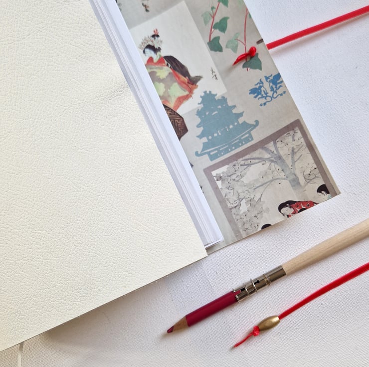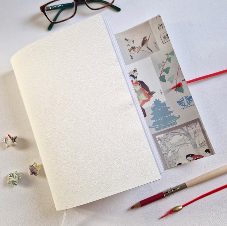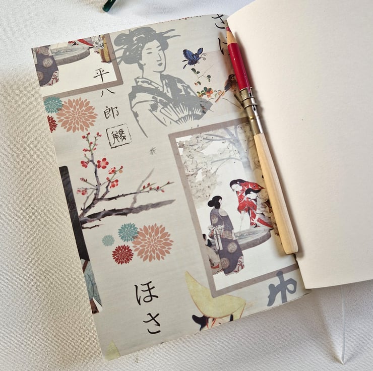 Beautiful Japanese Geisha Journal or Sketchbook, white leather with a beautiful Geisha paper lining the cover. Perfect as an Art Journal or Japan Travel Journal.
