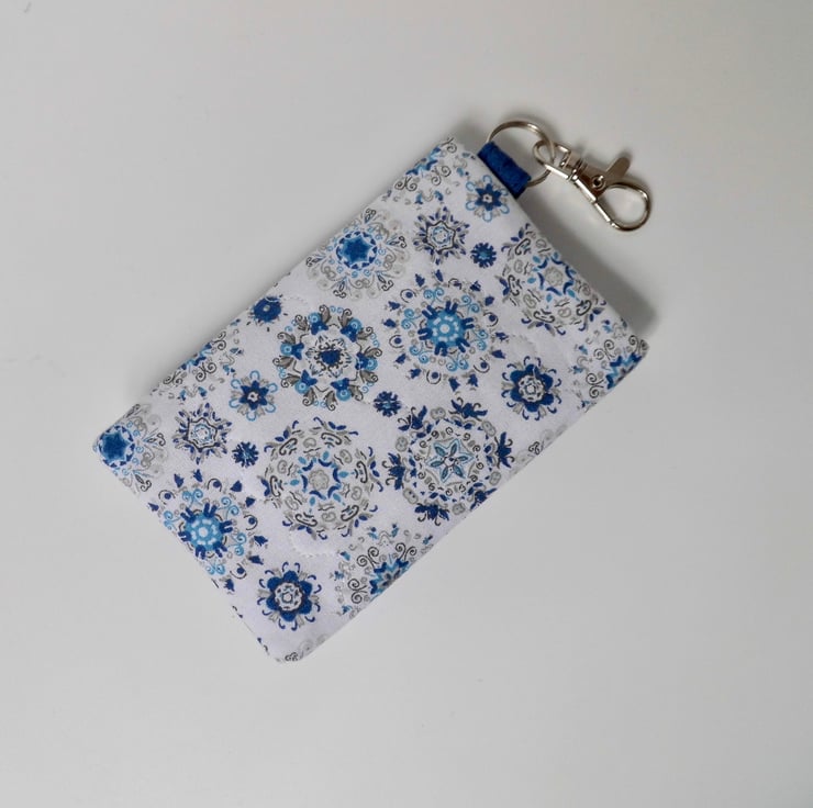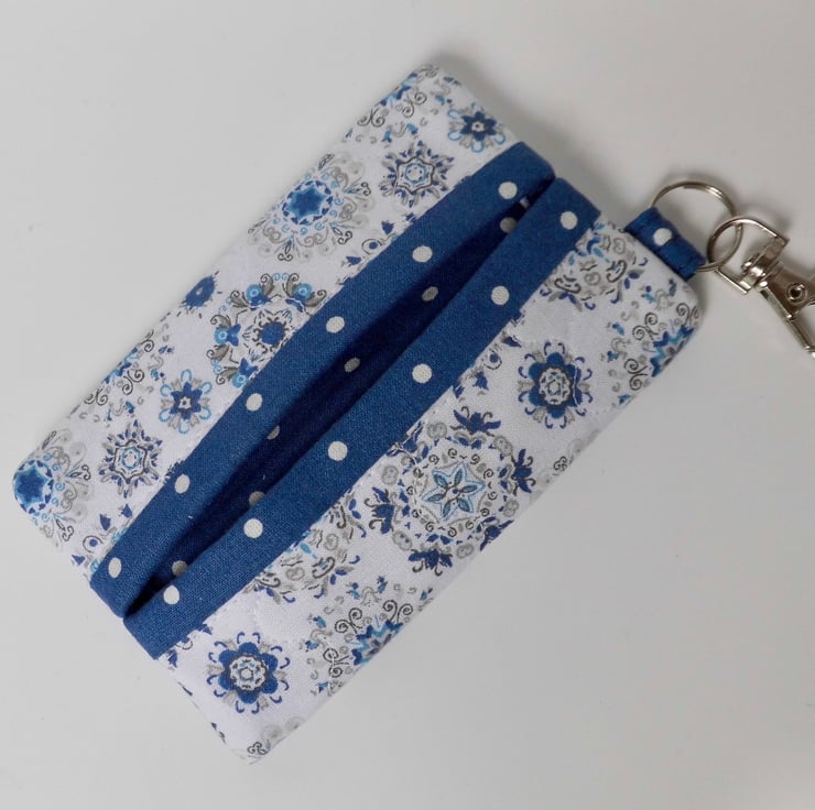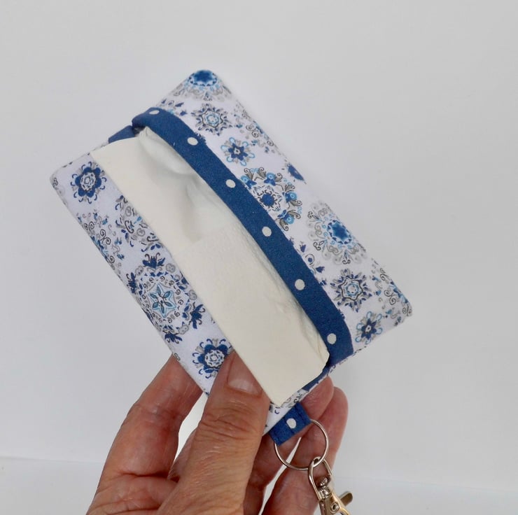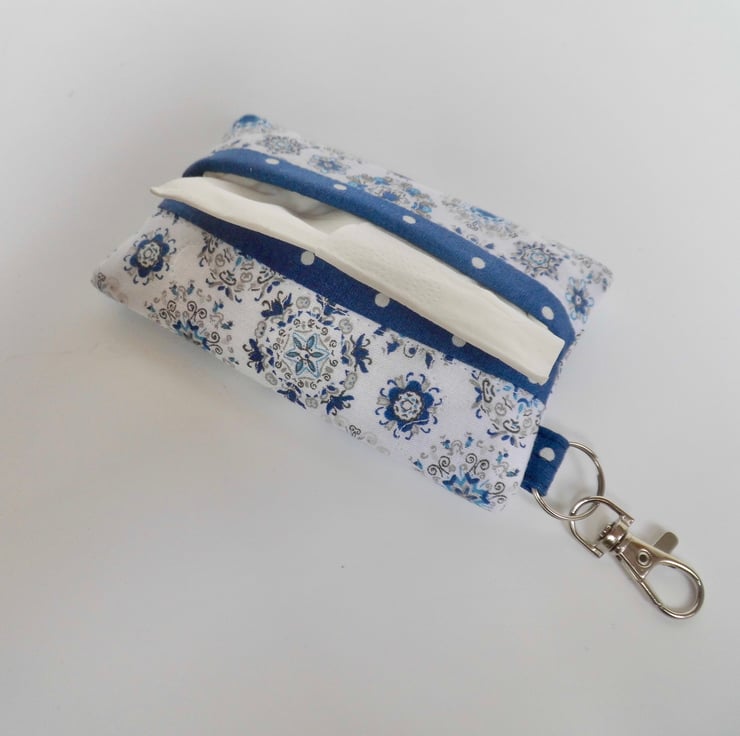 Here's a handy little pouch which I designed to keep a packet of tissues neat and tidy and clipped somewhere handy on your keyring or in your bag. But really it has many uses, because you could instead put a couple of spare fabric hankies in it, or spare face mask, or a foldaway shopping bag.