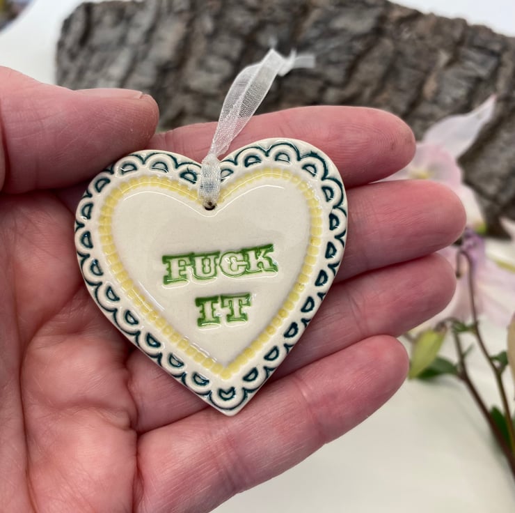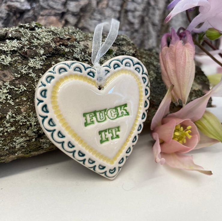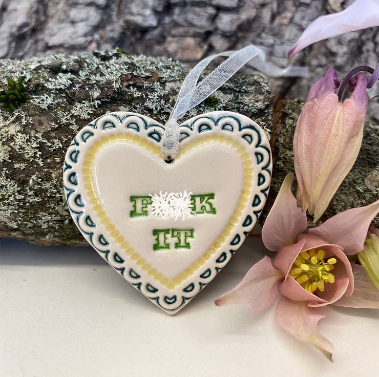 This little heart is made from white earthenware clay, imprinted with the words FUCK IT. The perfect gift to let someone know how much you love them! Some of the letters may be a bit higgledy piggledy but they have been stamped with love! It has been fired twice, once to the bisque stage and then a second firing for the clear glaze. It measures 4.5 centimetres wide x 5cm height x 5mm thick. It can be hung outside.