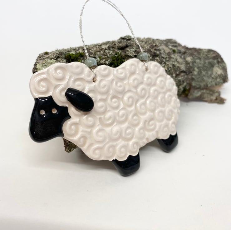 This ceramic sheep hanging decoration has been made from white earthenware clay, imprinted with pattern and underglazed with colour. It has then been fired in an electric kiln and glazed with a clear glossy glaze. If you love sheep or even pottery sheep, this is the decoration for you!