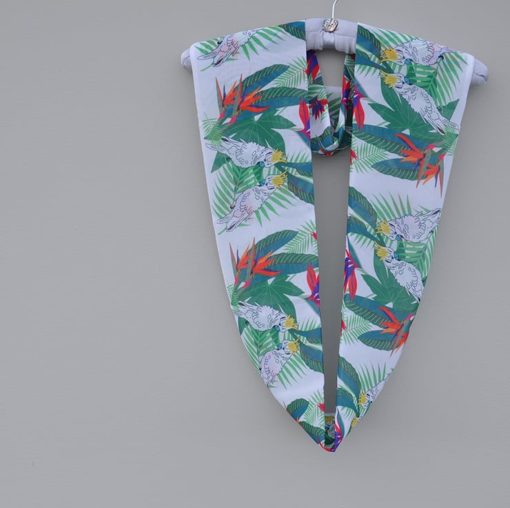 Lightweight chiffon infinity scarf featuring cockatoos and bird of paradise flowers on a white background. Totally tropical. Can be worn as a single or double loop.
