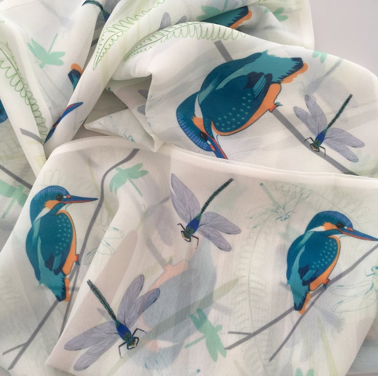 Lightweight chiffon infinity scarf featuring kingfishers, dragonflies and river reeds on an ivory background. Can be worn as a single or double loop.