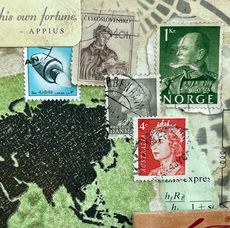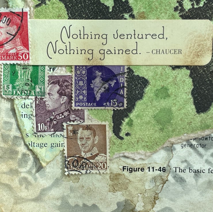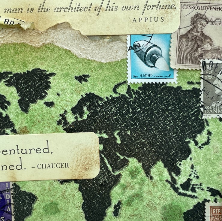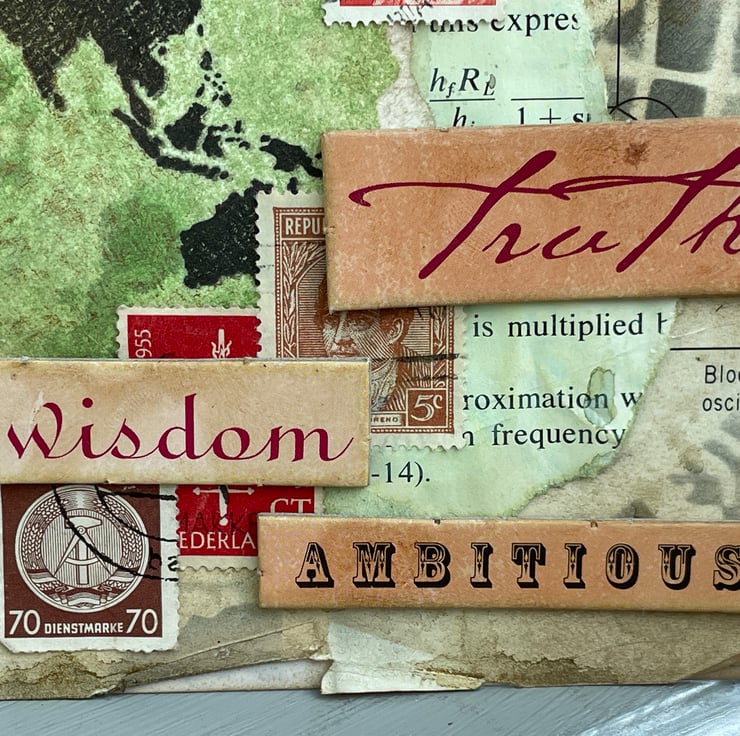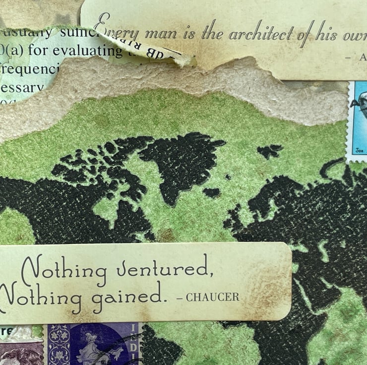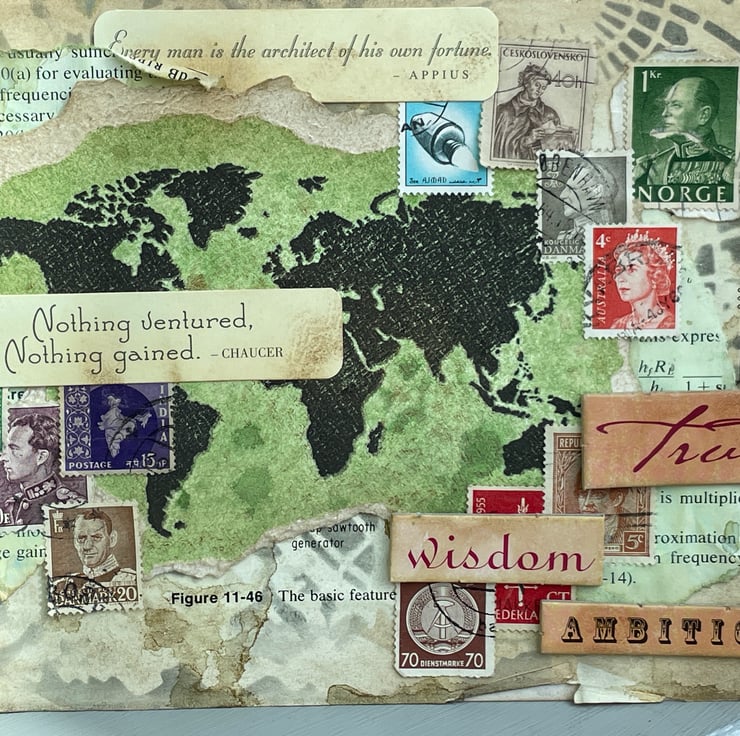 A bit of mixed media that makes a fantastic and original card. This A5 sized card is different to anything you will see. The background is an old book page which has been aged and stenciled with a globe image. There is a stamped image of a world map that has been torn at the edges and aged. The design has been finished with genuine old postage stamps and inspirational quotes such as Wisdom, Truth, Nothing ventured, nothing gained. The card would be great for a birthday or Father's day.