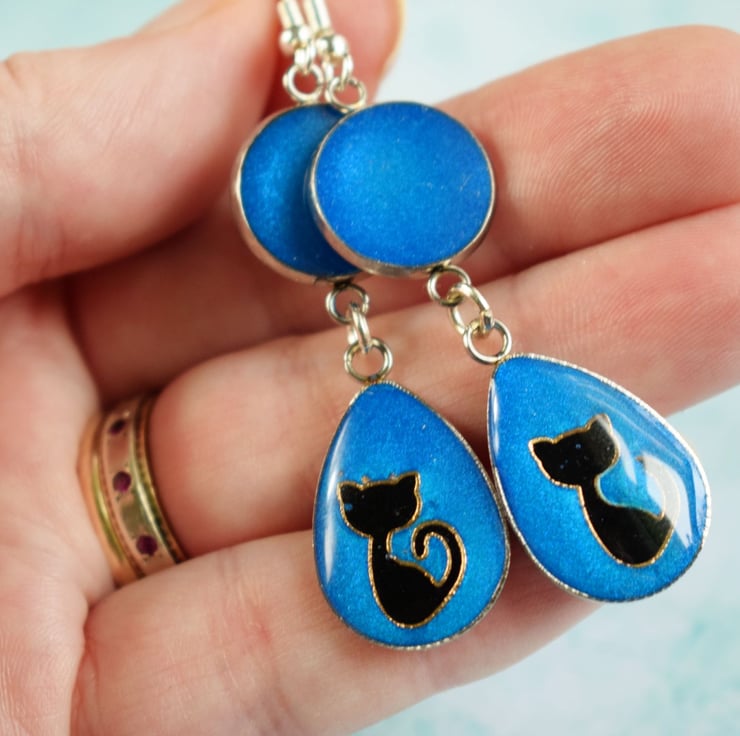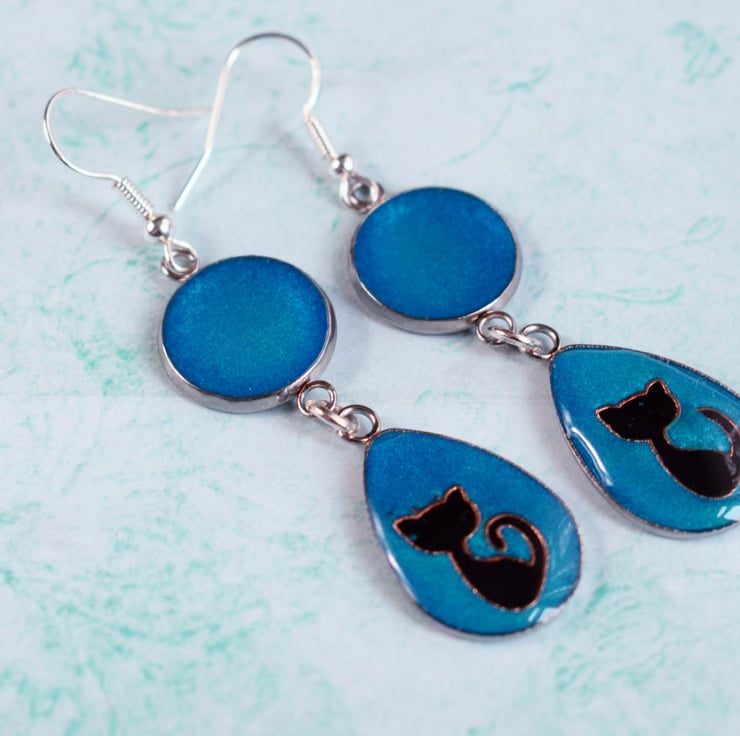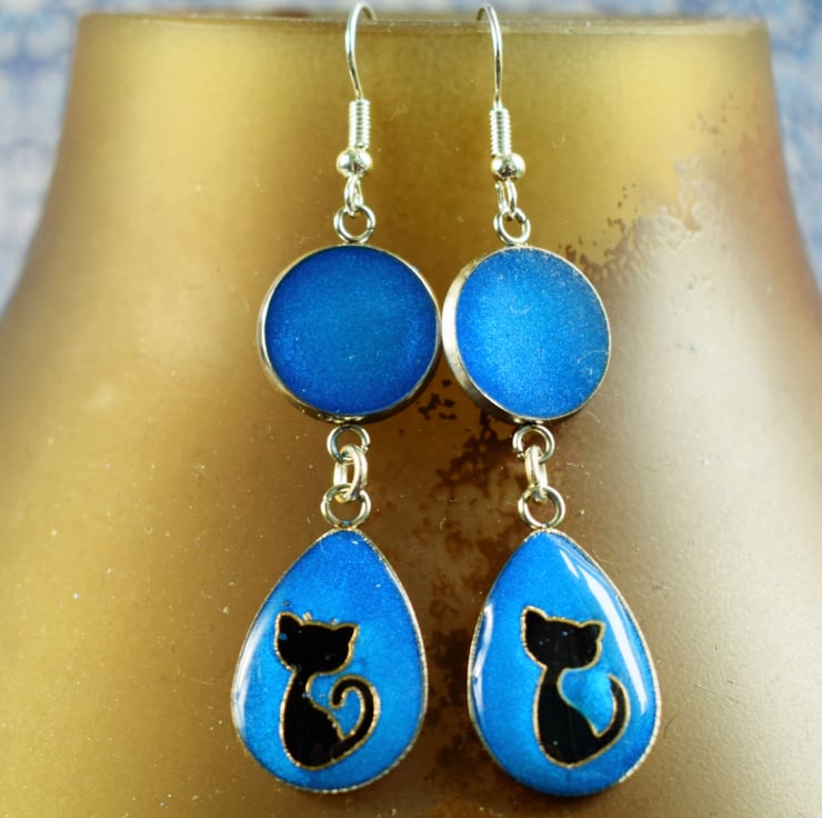 Black Cat Dangle Earrings, Black Cat Earrings with Blue Background