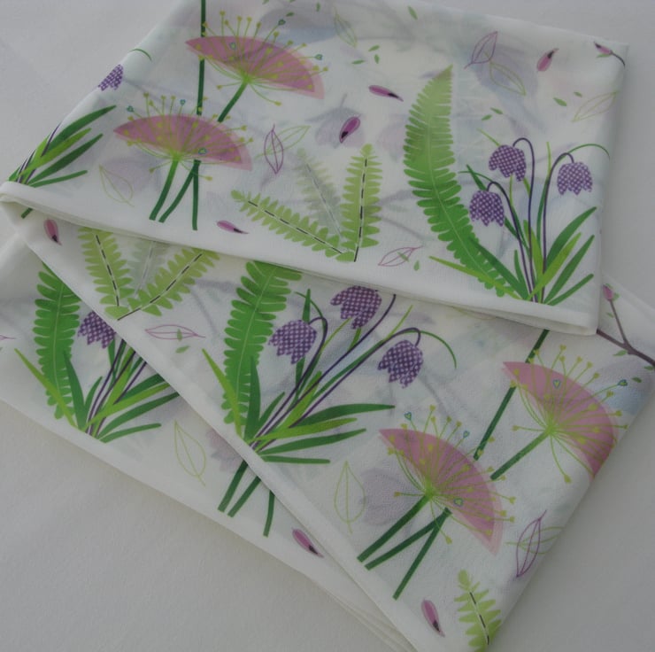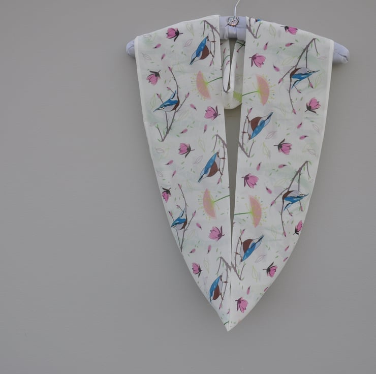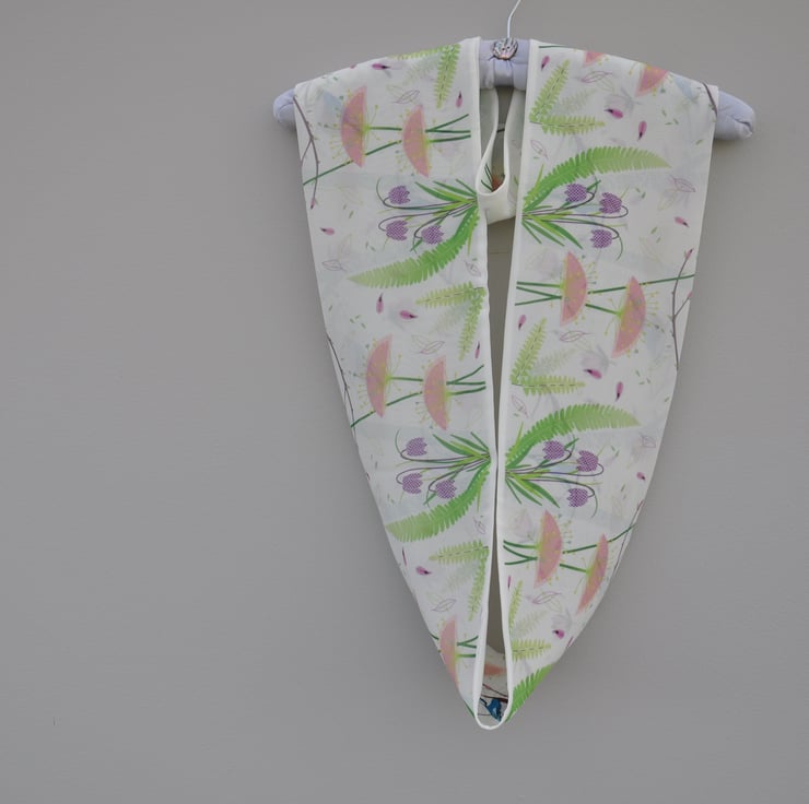 Lightweight chiffon infinity scarf featuring nuthatches, magnolia blooms and snakeshead fritillaries on an ivory background and interspersed with tiny buds and ferns. Can be worn as a single or double loop.