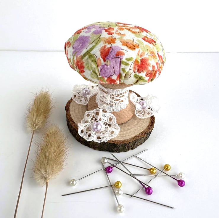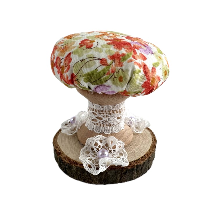 Mushroom pin cushion with floral pattern. This pretty pin cushion has been made to resemble a mushroom surrounded by lace flowers. The top is made from a gorgeous cotton floral print in delicate shades of orange, lilac and pale green on a cream background. It is stuffed with polyester hollow fibre filling. The stem of the mushroom is a wooden cotton reel wrapped with pretty cream lace. The mushroom sits on a log slice base, along with three flowers, which I have hand made from cream lace and lilac faux pearls.
