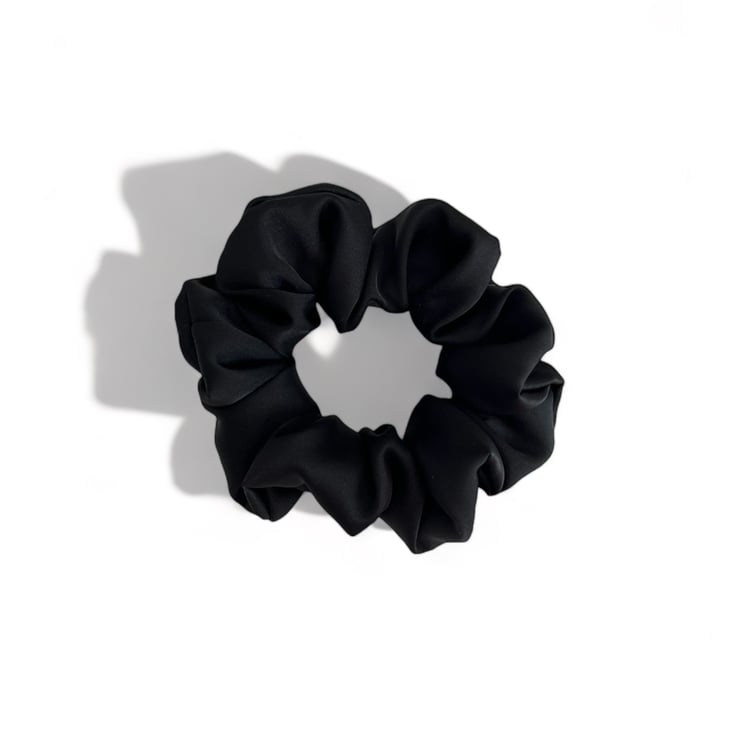 Silky smooth black satin scrunchie, handmade by me.