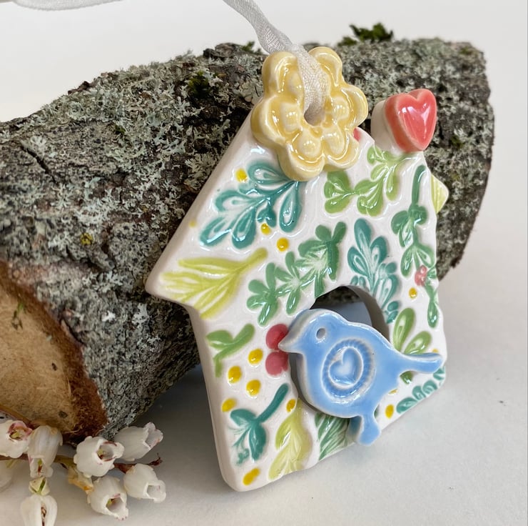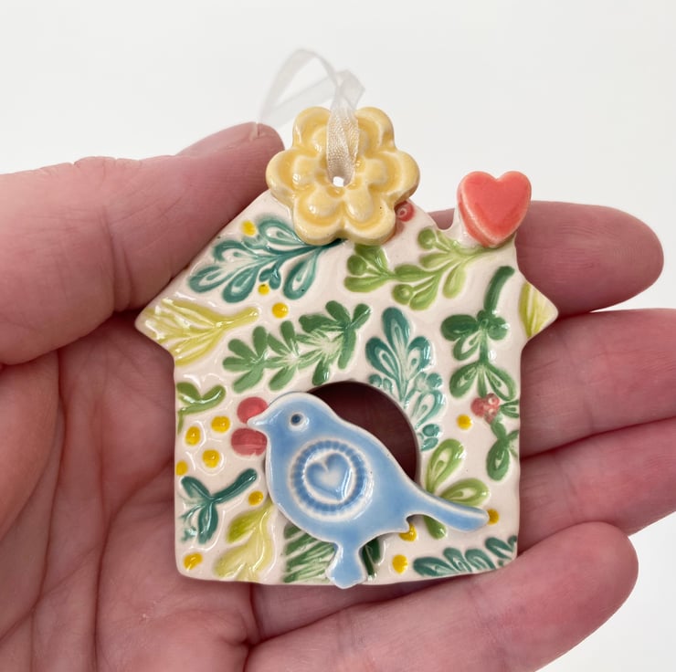 This little bird house decoration is made from white earthenware clay and finshed with a little pottery bird. It has been fired twice and finished with a glossy glaze for a lovely smooth finish. It measures 7.5 x 7cm and hangs from rustic brown string