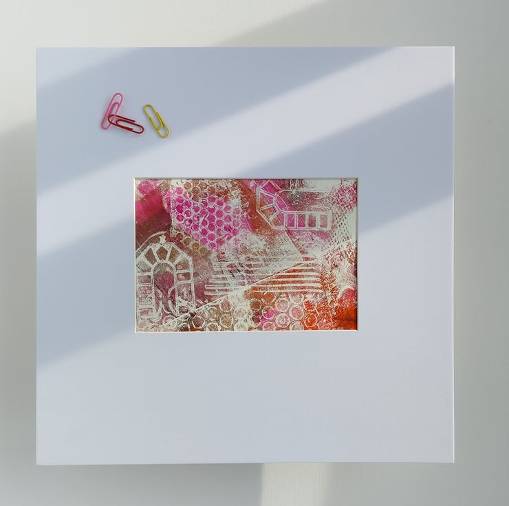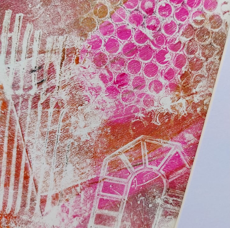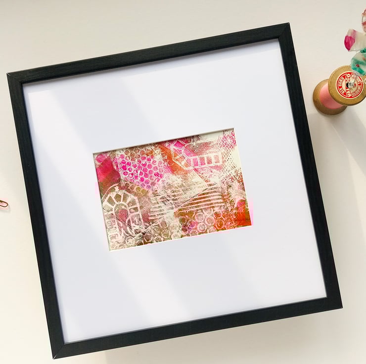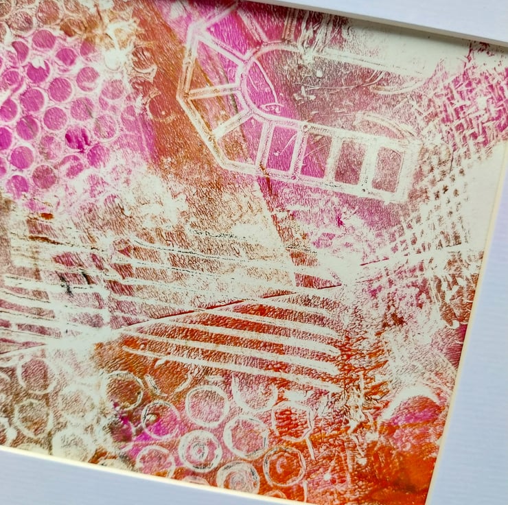 Here I have used items from the tool box to create this original mono print, which I have then hand coloured to bring out the detail of the graphic imagery.