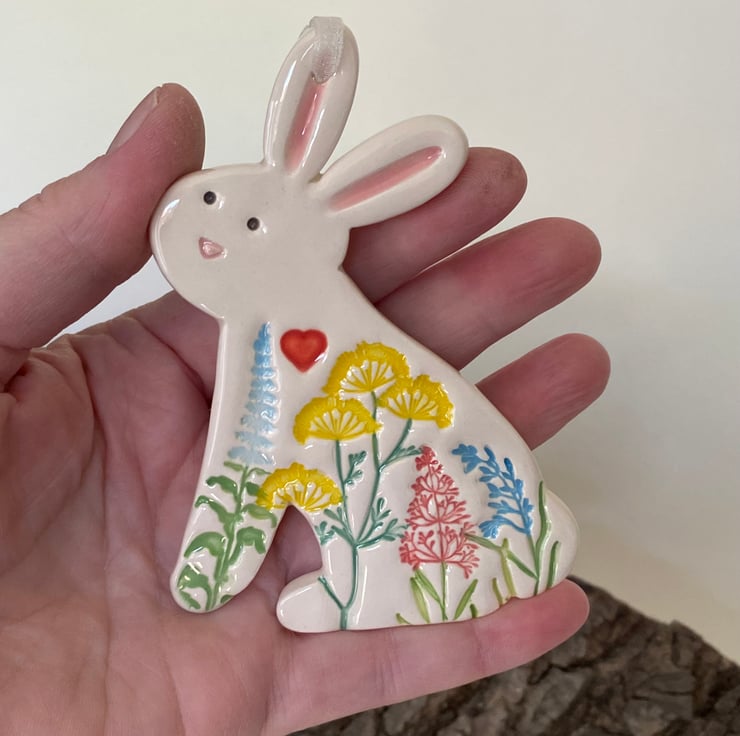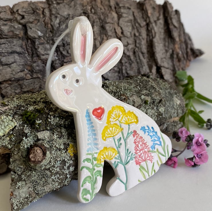 This little ceramic bunny is made from white earthenware clay and imprinted with a floral design in gorgeous Spring colours. This has been fired in an electric pottery kiln, so it is nice and strong. It measures 10cm x 7.5cm and hangs from a matching cream organza ribbon. It is glazed on the front and left plain on the back. Cute Pottery Rabbit.