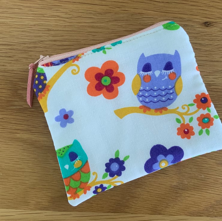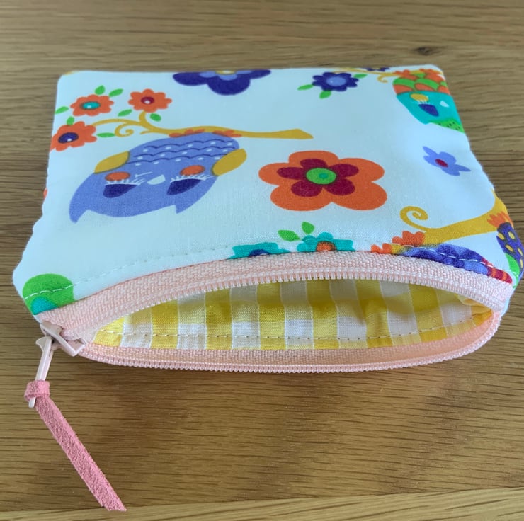 Children’s coin purse made from cotton fabric in an owl design. It has a layer of interlining in between to give it a little structure. It is lined in a coordinating cotton fabric and finished with a faux suede cord attached to the zip.