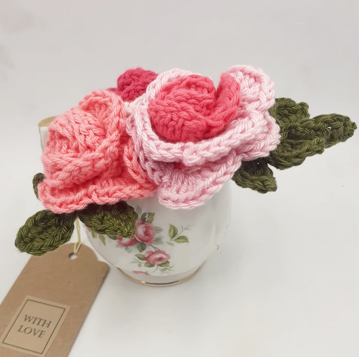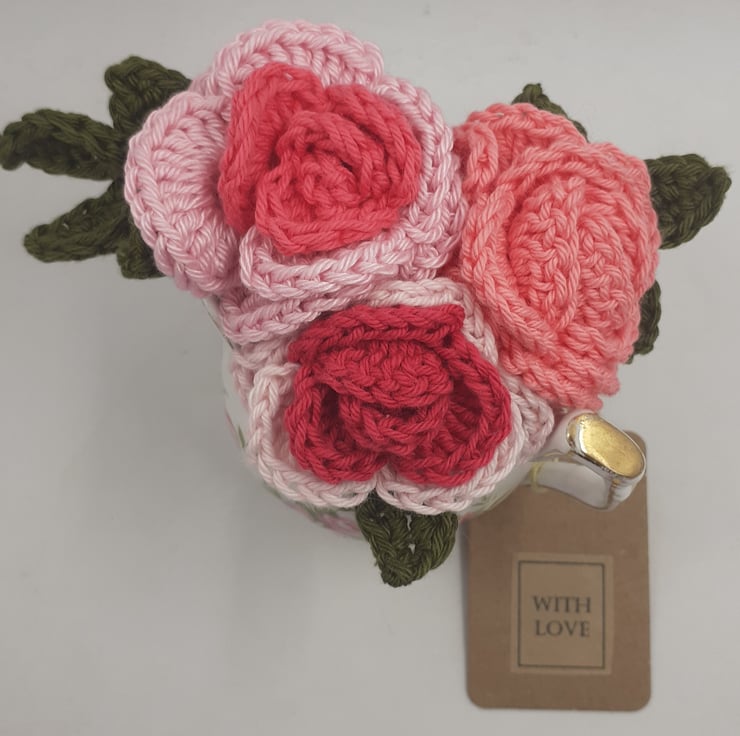 This diminutive vintage china jug is blooming with pretty pink roses crocheted in cotton and held firmly in place inside a roll of corrugated card concealed beneath a circle of dark green crochet.