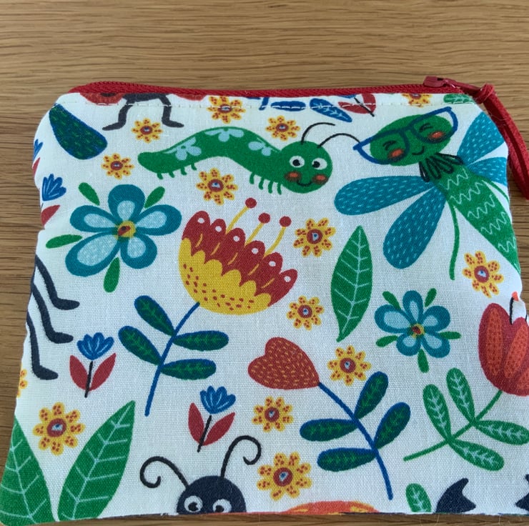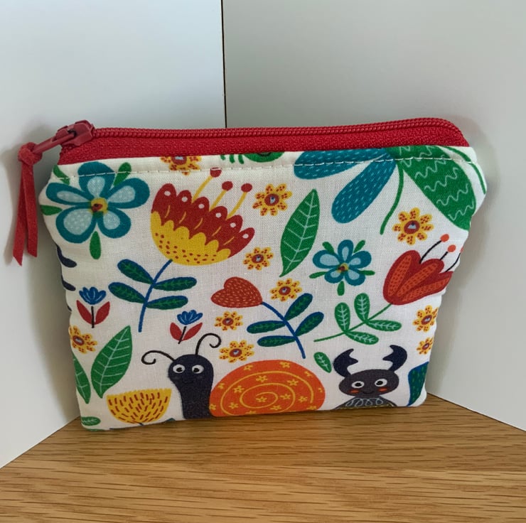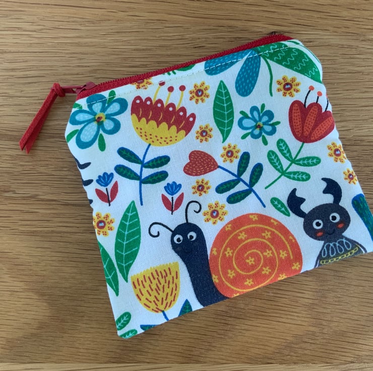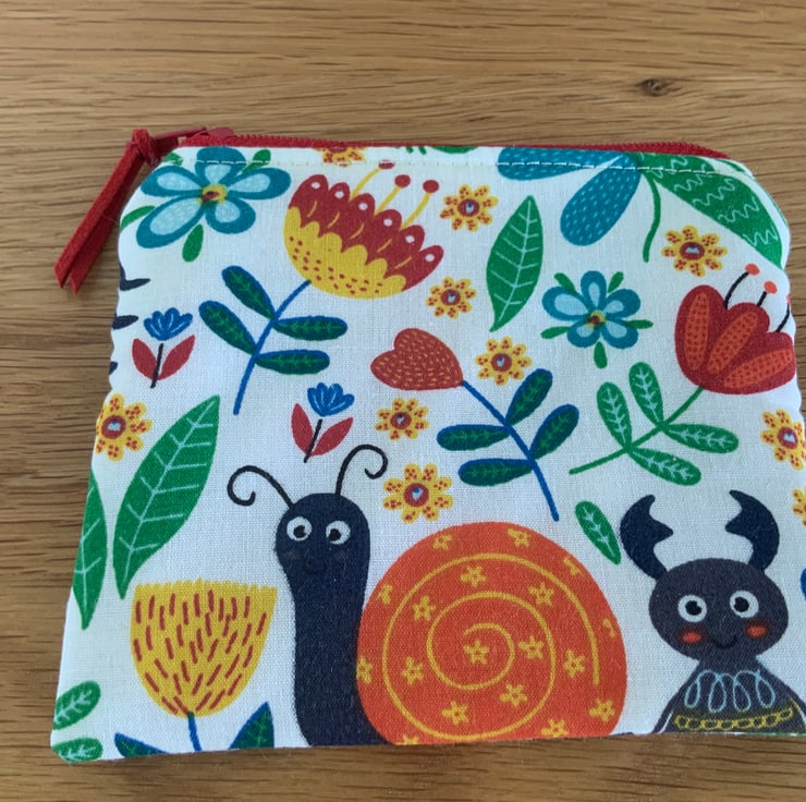 Children’s coin purse made from cotton fabric in a garden creature design. It has a layer of interlining in between to give it a little structure. It is lined in a coordinating cotton fabric and finished with a faux suede cord attached to the zip.