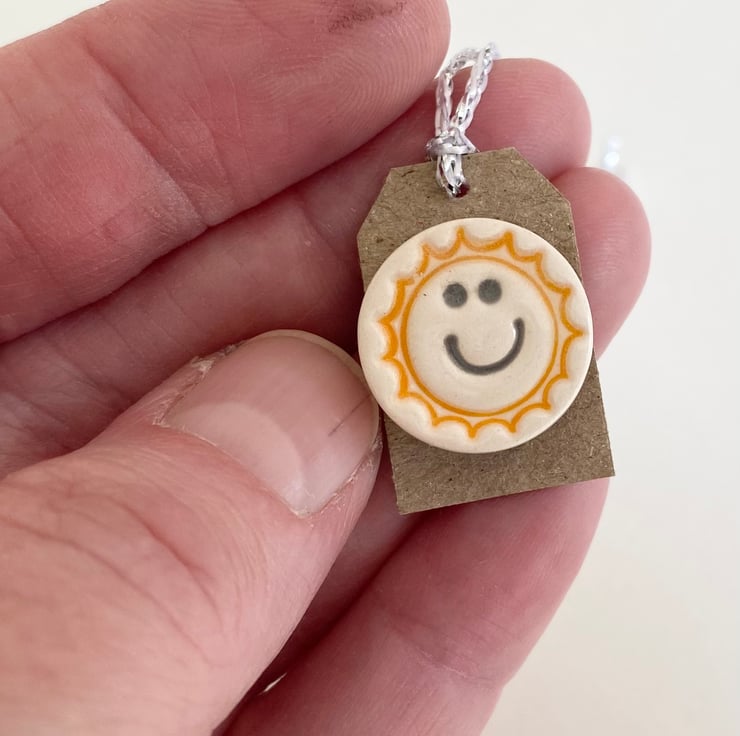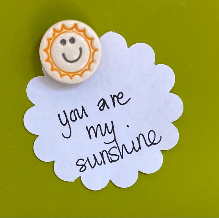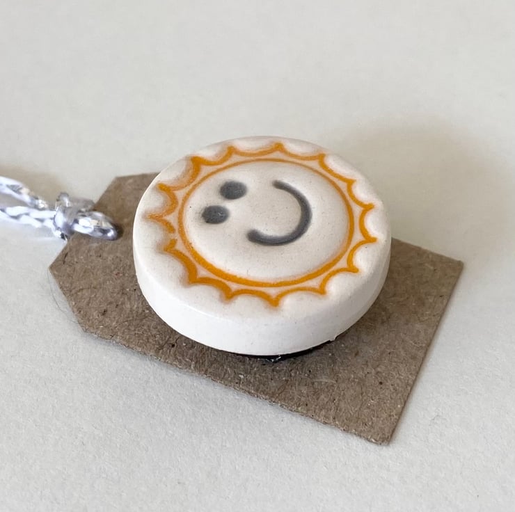 This teeny weeny little pottery magnet is made from white earthenware clay. It has been imprinted with a sunshine design and colour added. It has then been fired in the kiln, glazed with a clear, glossy glaze and then fired again. It has a nice substantial magnet on the back and then I have mounted them onto a gift tag with glue dots (which easily peel off) Each magnet measures 1cm diameter x 1cm deep.