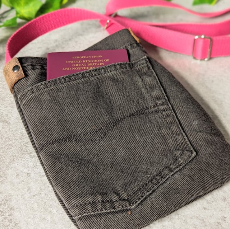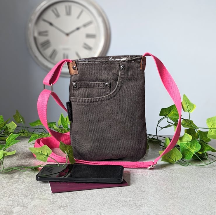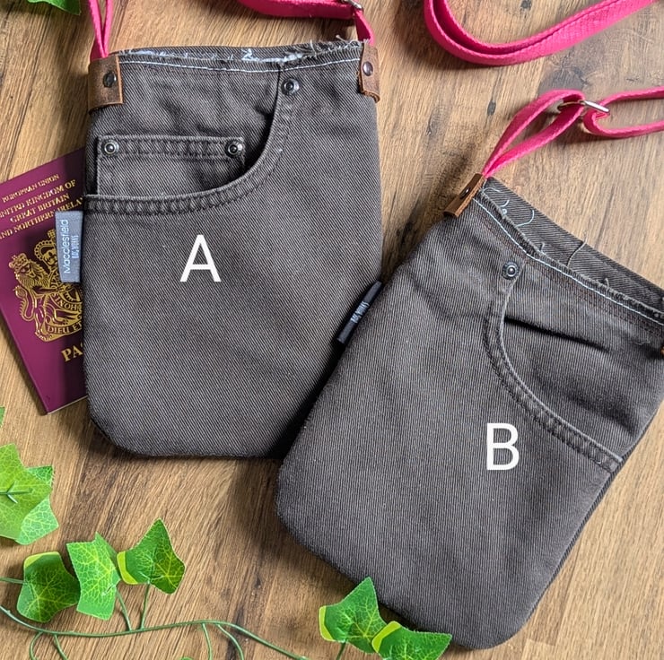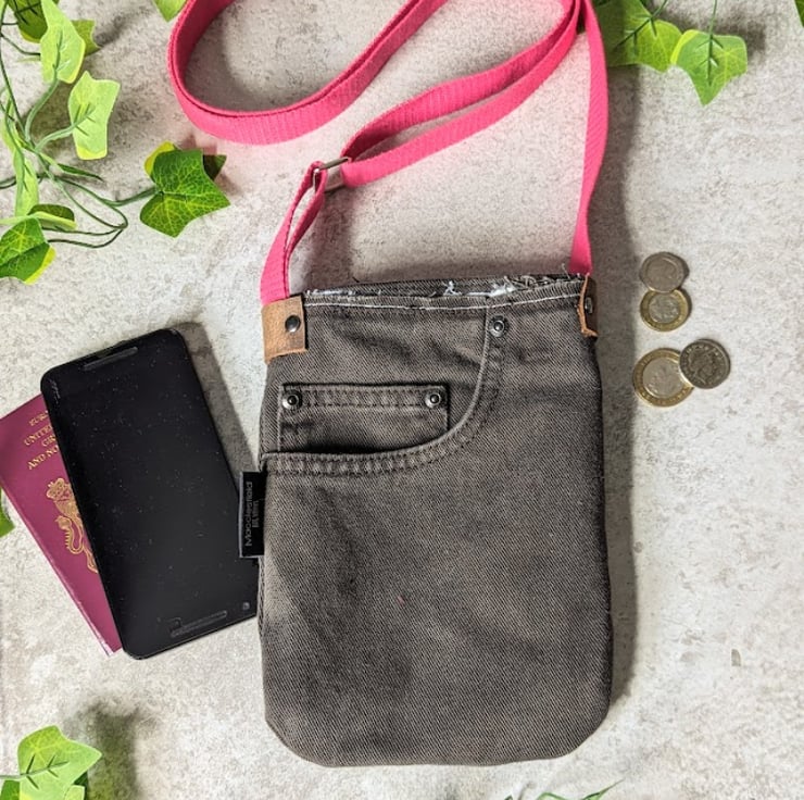 Mini phone bag handmade using preloved brown denim jeans. This recycled mini cross body phone bag has been designed to be light, casual and convenient to use.