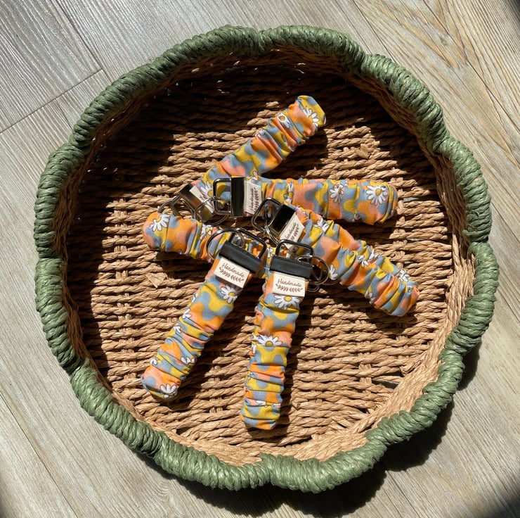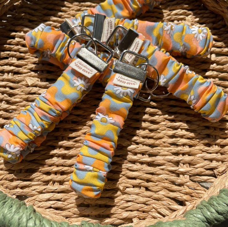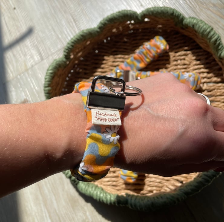 Groovy pattern with daisys, wristlet keychains perfect for when you have your hands full, no need to dig around in your handbag just pop this scrunchie type keychain around your wrist. Groovy wave and Daisy fabric design with silver hardware. This keychain, makes a perfect gift.