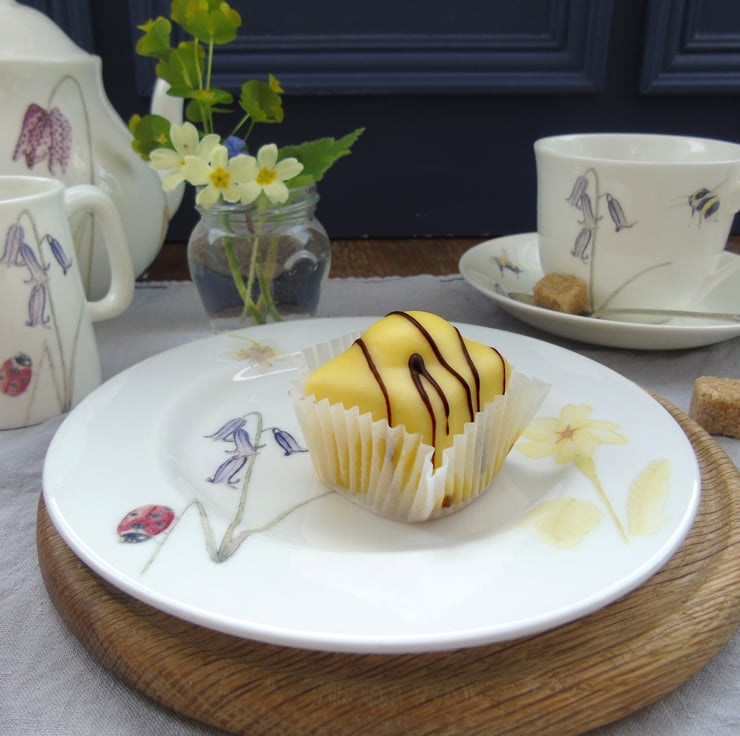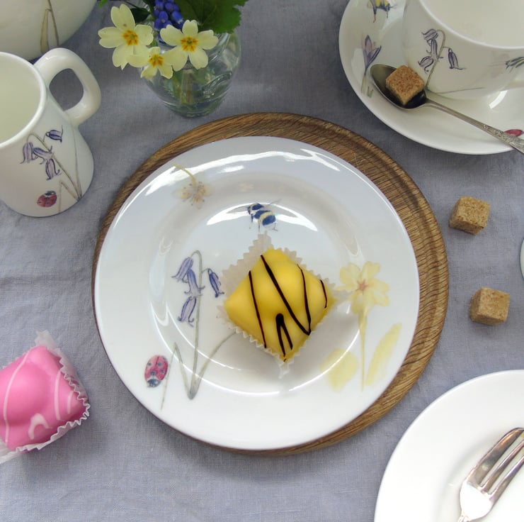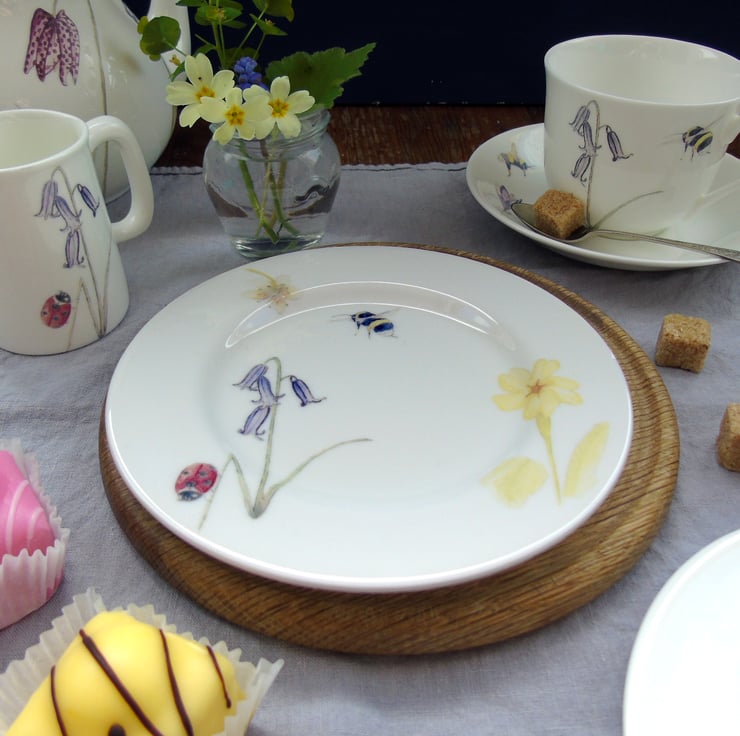 Please note the photographs are examples only and the design on your tea plate will not exactly match them but will feature a combination of the imagery shown including bees, ladybirds, bluebells, primroses, forget me nots, crocus and snake's head fritillary. If you would prefer to choose your cake plate from the current stock I have available, please get in touch and I can send you photographs.