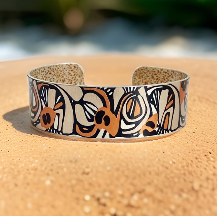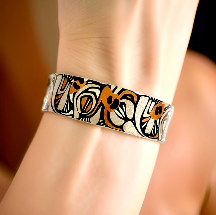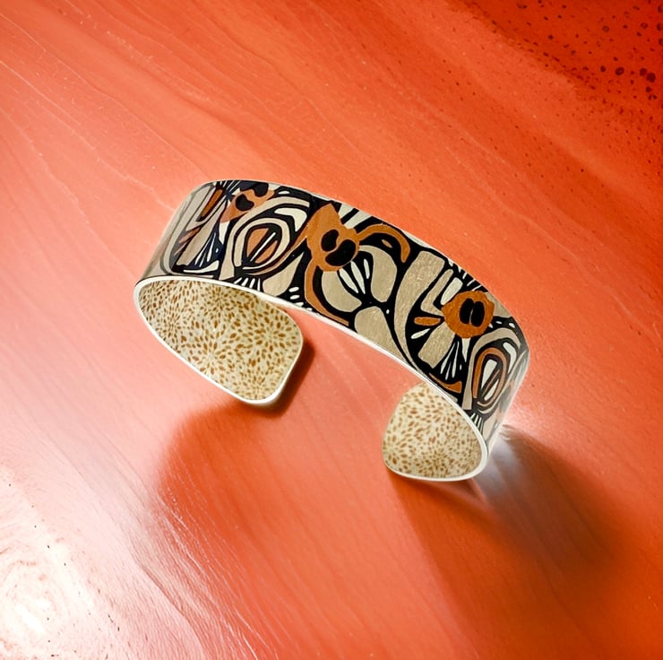 This is a cuff bracelet which I have handmade with an abstract design. Artistic with black and tan colours on a brushed silver background. This bracelet can be engraved with a personal message on the reverse for a small extra fee (Optional). Matching earrings and pendant are available.