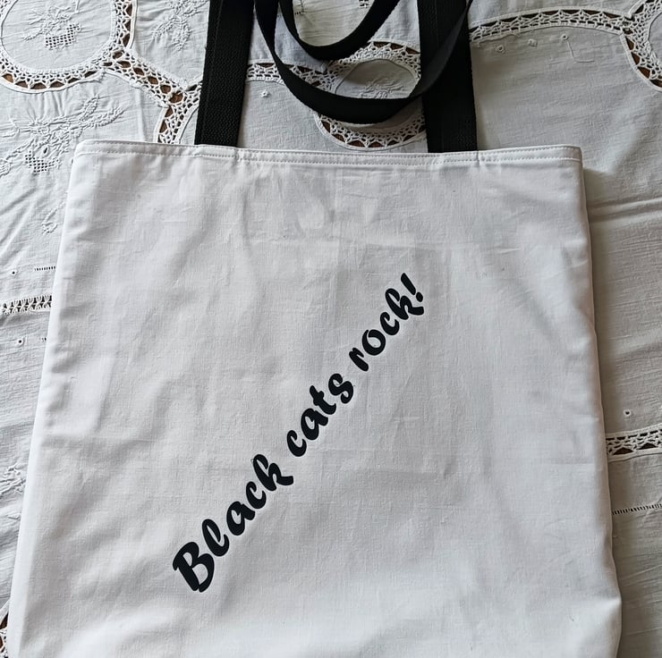 The bag is made from plain white woven cotton poplin, with a black cat printed on the front and the phrase “Black cats rock!” on the reverse.