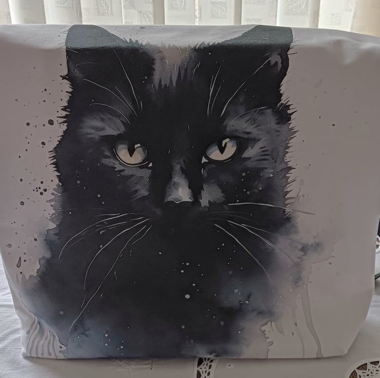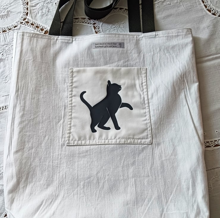 This is an ideal shopping bag/tote bag, with a gorgeous black cat design, fully lined with one inside pocket with a cat silhouette, ideal for your purse, shopping list, keys etc.