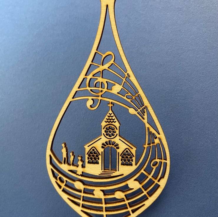The music curls round a cut-out church scene so that it can be read from both sides of the decoration.