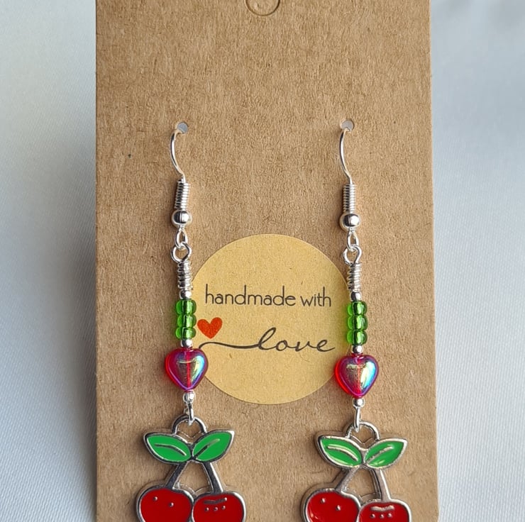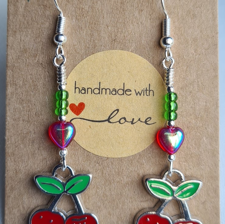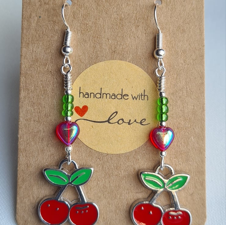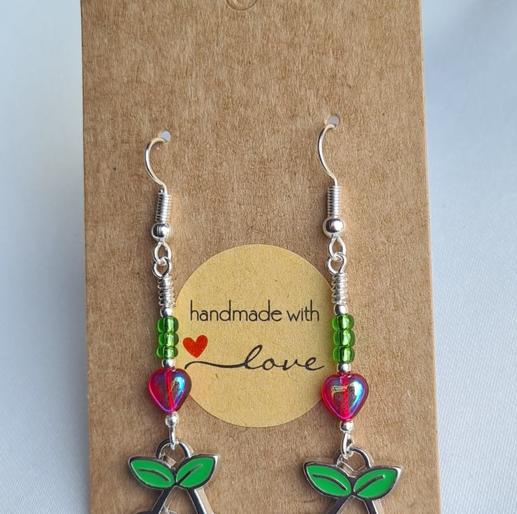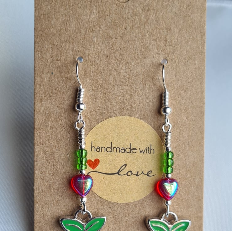 Earring length is approx 6.2cm from top of the ear wire to the bottom of the charms. Beads are heart-shaped red glass and Green seed beads, charms are metal alloy/enamel. Ear wires are silver tone stainless steel, if you require alternative ear wires please go to the Choose Options box. (Sterling Silver ear wires are available at a small additional cost). These earring come on an Earring card, and in a gift bag.