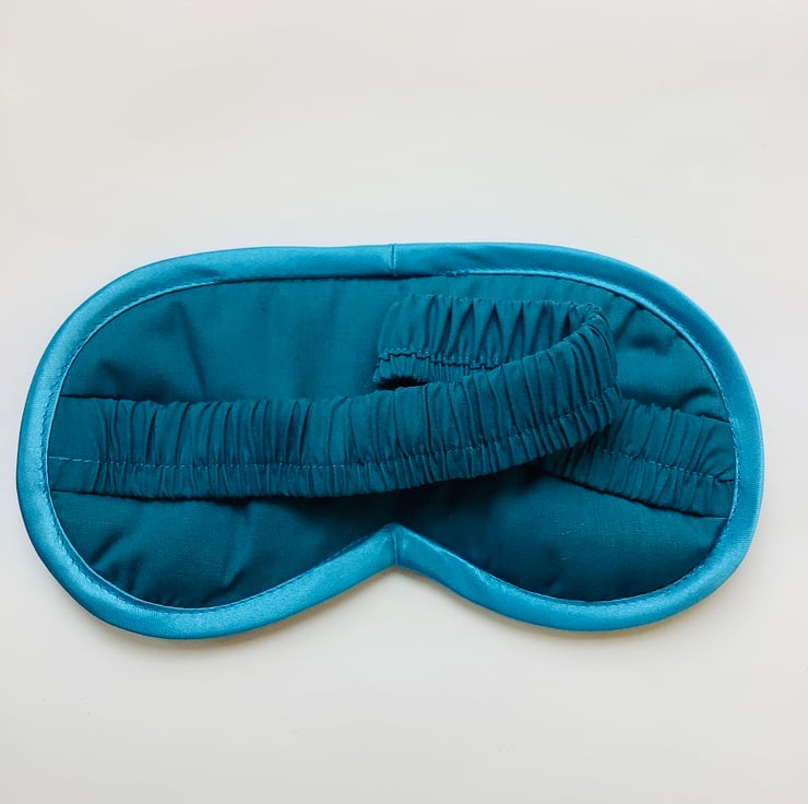 The eye mask has a covered elasticated strap, it is lined with 100% soft cotton, filled with padding made of 100% cotton and finished with the satin bias-binding tape.