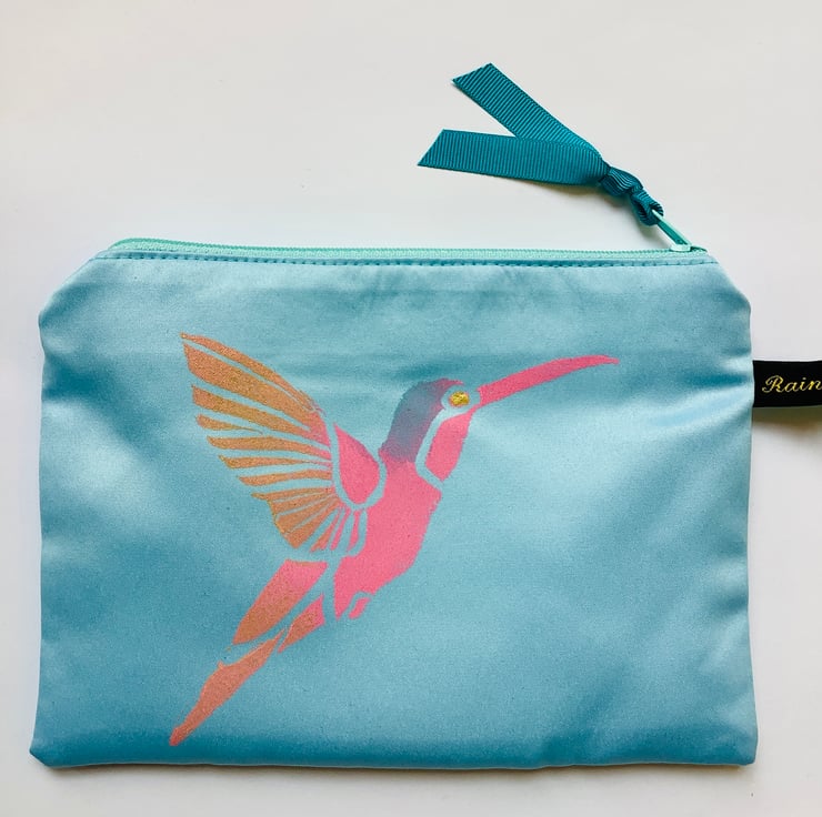 Introducing the exquisite Hummingbird Duchess Satin zip-up pouch, a stunning accessory that seamlessly blends elegance with functionality.
