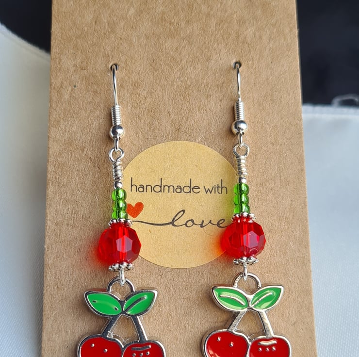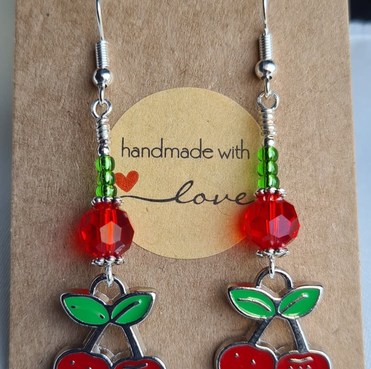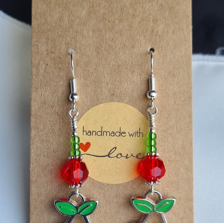 Earring length is approx 6.2cm from top of the ear wire to the bottom of the charms. Beads are faceted red glass, Green glass seed beads and charms are metal alloy/enamel. Ear wires are silver tone stainless steel, if you require alternative ear wires please go to the Choose Options box. (Sterling Silver ear wires are available at a small additional cost). These earring come on an Earring card, and in a gift bag.