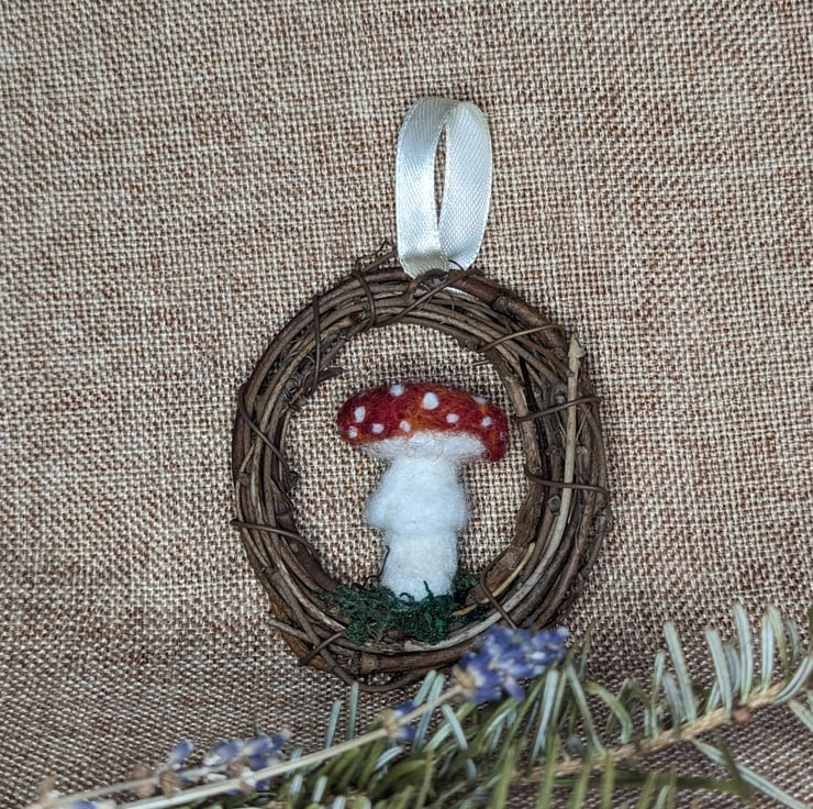 Needle felted fly agaric toadstool on a wreath, measuring 70cm in diameter.