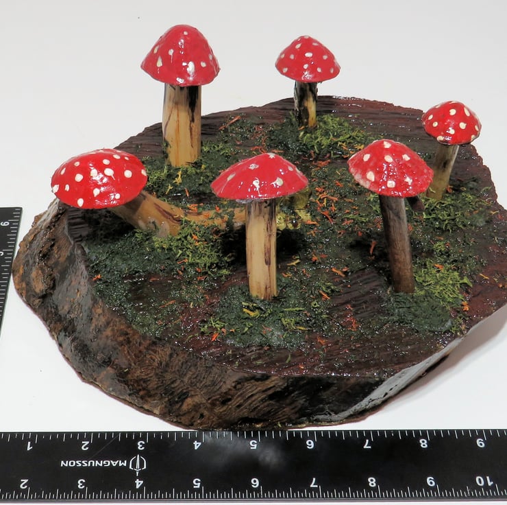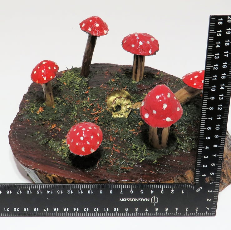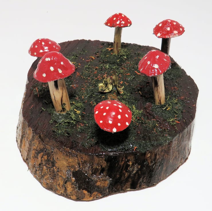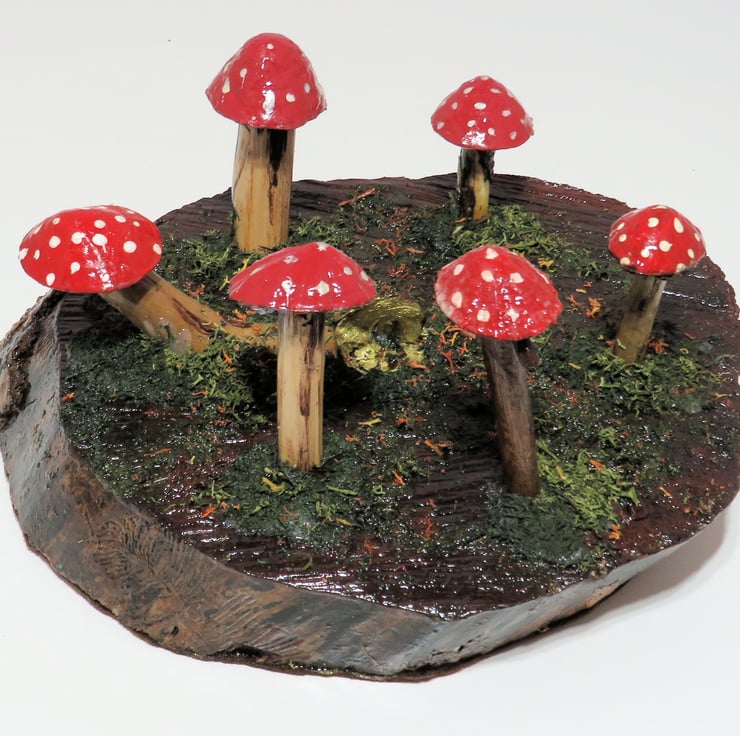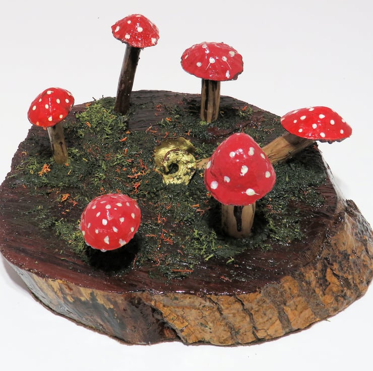 This lovely composition of magical mushrooms and fly agaric toadstools look adorable on their own on a shelf or table, desktop or among your indoor plants, particularly an ivy or fern that could be allowed to flow over it.
