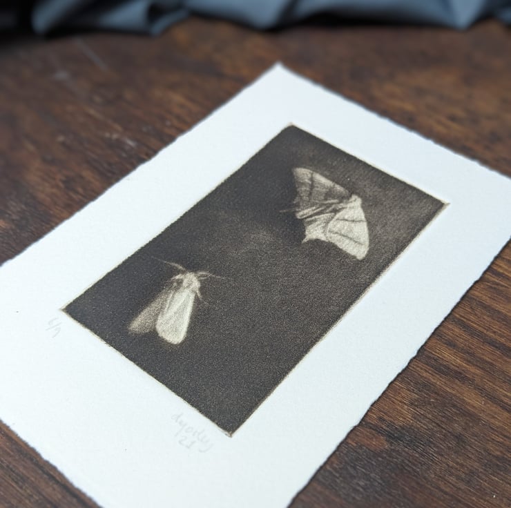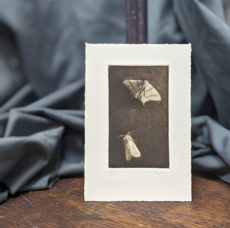 A small mezzotint of two moths, hand printed and signed. Edition of 9. The overall size of the work is 10x14cm and the image size is 5x7cm.