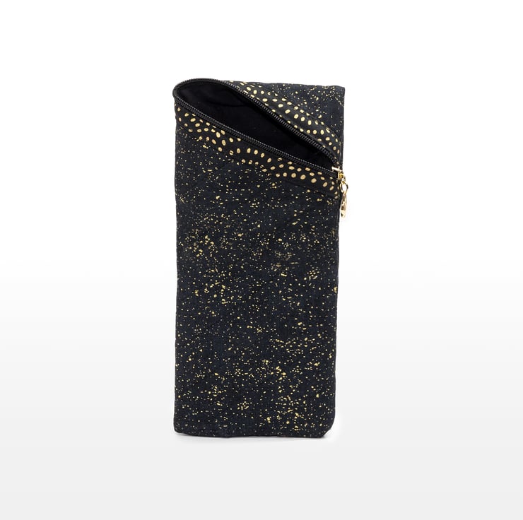 Stylish Zipped Case for sunglasses, eyeglasses or reading glasses. Black and Gold flecked print with contrasting trim, gold heart-shaped zip pull. 100% cotton, fully lined, soft padding for protection without bulk, non-scratch nylon zip.