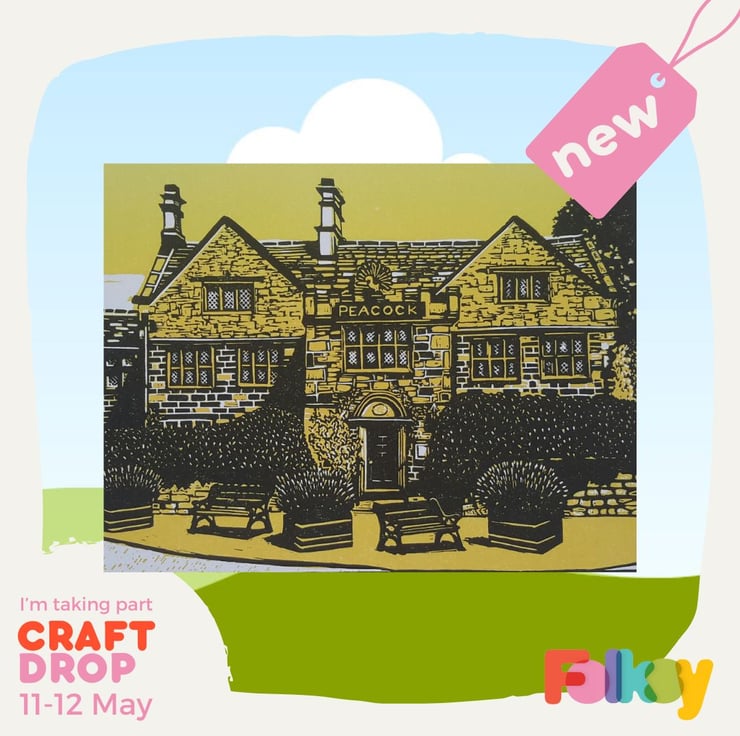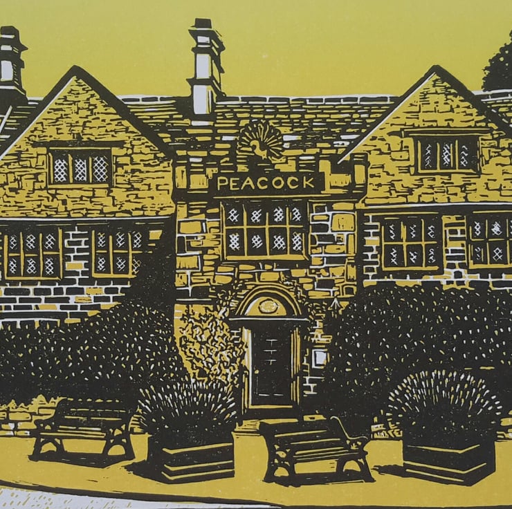 A limited edition lino print of an historic Derbyshire sandstone building in the picturesque Peak District village of Rowsley. Originally built in the 1600s as a Manor House it has been an Inn and Hotel since the 1800s