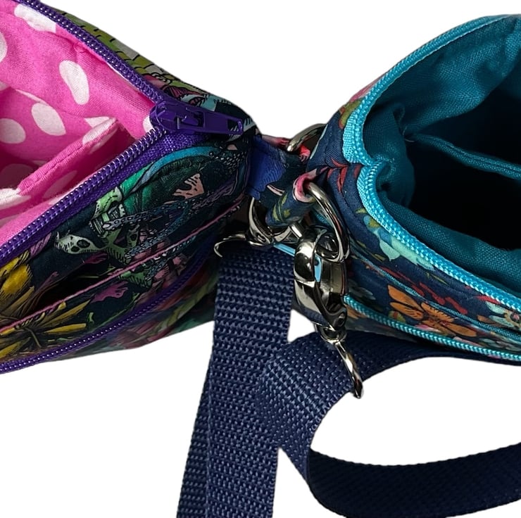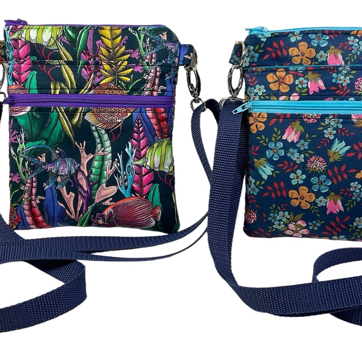 The strap itself is approx 133cm (52.5") in length, long enough to go across your body and is fully adjustable. Each bag closes with a toning zip. The bag is fully wadded and interfaced for structure. contents shown for display and not included in sale. pattern placement may vary