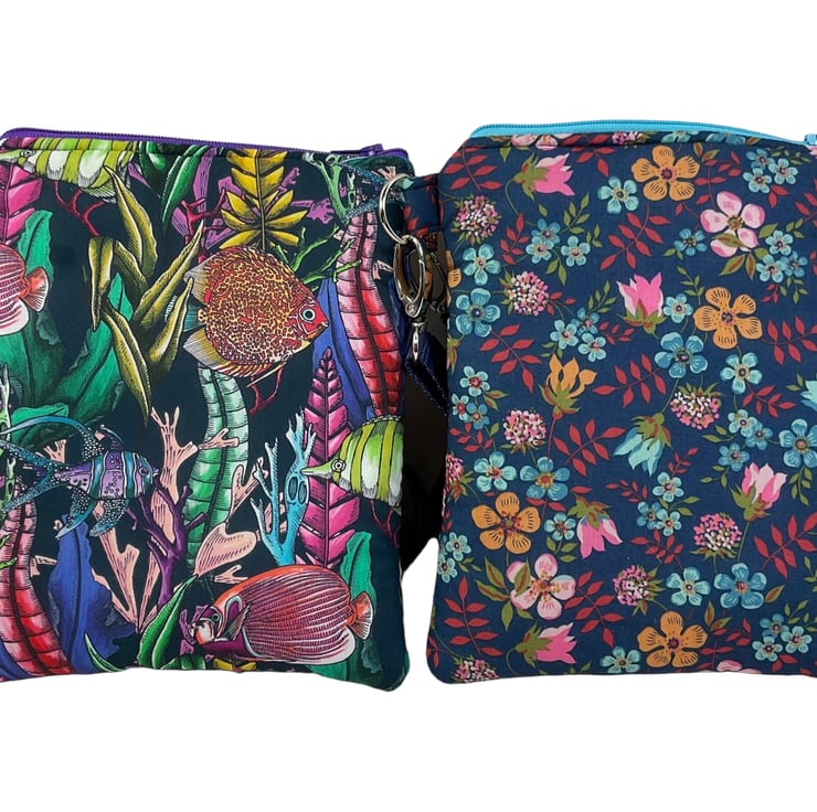 First is the pretty floral ‘Edenham’ on a navy base, lined in deep teal blue coloured cotton. Next is The unique ‘The aquatic Garden’ with its brightly coloured Fish and coral print fabric on a deep navy base is lined in candy pink and white spot cotton.