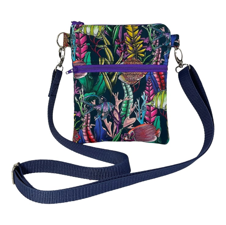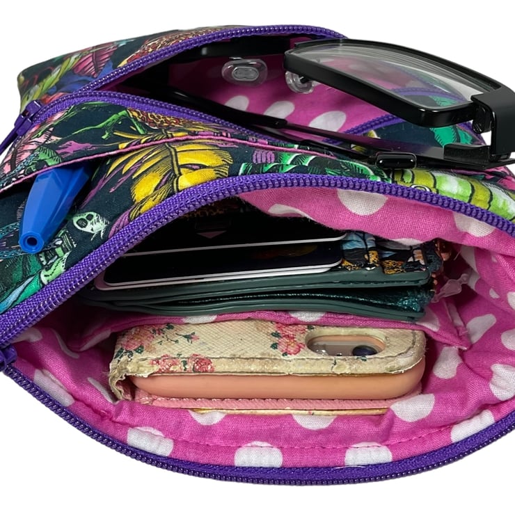 The strap itself is approx 133cm (52.5") in length, long enough to go across your body and is fully adjustable. Each bag closes with a toning zip. The bag is fully wadded and interfaced for structure. contents shown for display and not included in sale. pattern placement may vary
