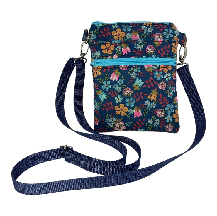 A choice of 2 of very pretty Liberty print, small and slim phone sized shoulder bag. Made in Liberty's luxury Tana Lawn with its almost silk like texture. This handy bag is slim so sits close to your body, and will hold the basics when you want to grab a small bag for a trip out. I have managed to fit a purse, my phone (iPhone in a case) and a diary.