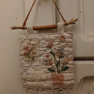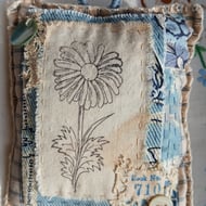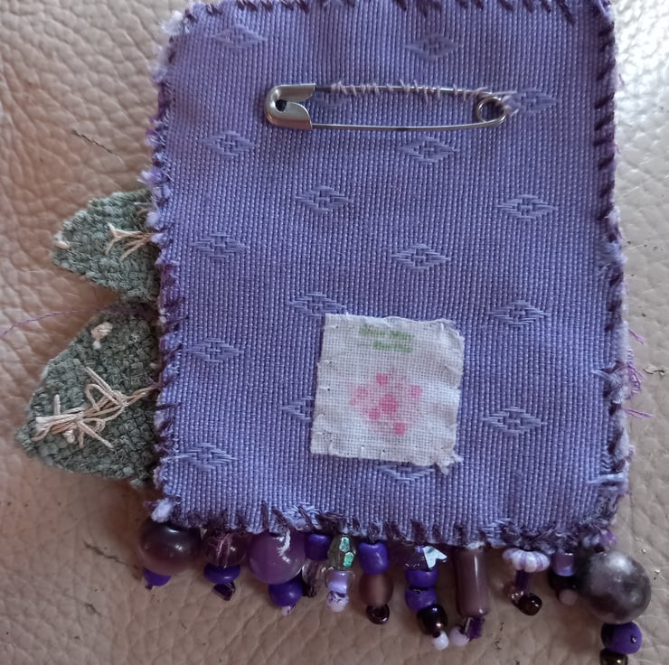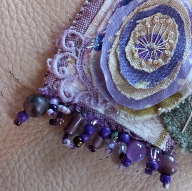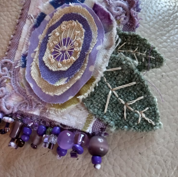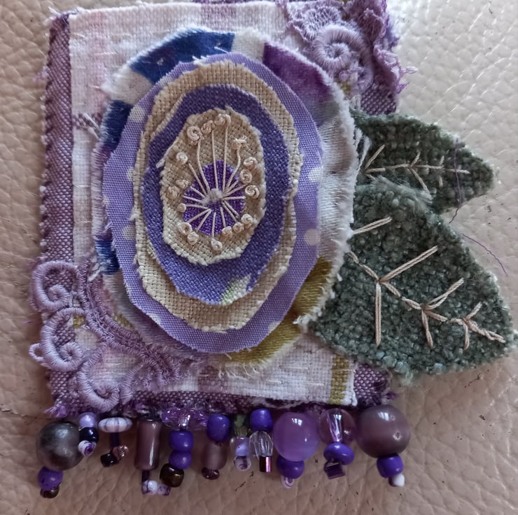 The purple flower on tia brooch is made from a mixture of fabric scraps joined together by the pistol stitches in the centre. The leaves are made from a sample of green chenille fabric and are stitched with vintage thread. The flower is mounted onto 2 pieces if recycled fabric and backed with an vintage piece of Laura Ashley fabric. I've added eco-dyed lace as decoration, along with beads salvaged from broken jewellery.