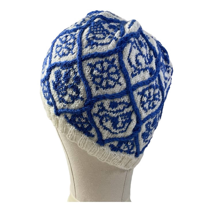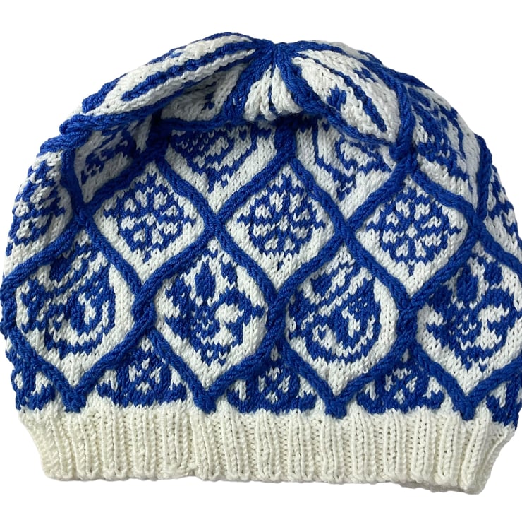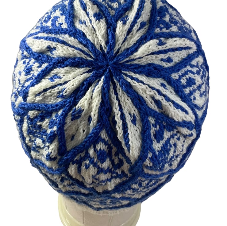 The main yarn is a royal blue. The contrast is cream. The pattern develops into an eye catching flower design at the crown of the head.
