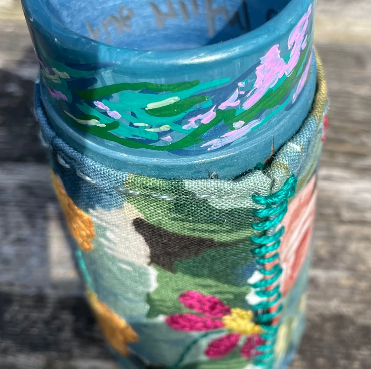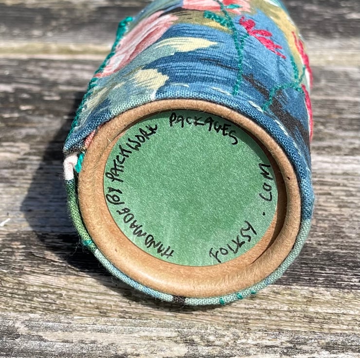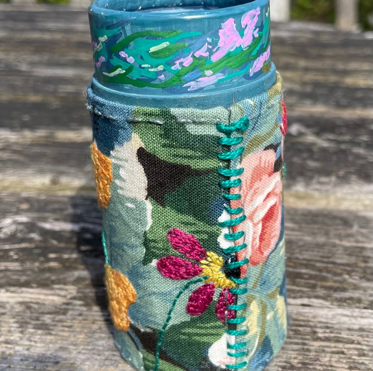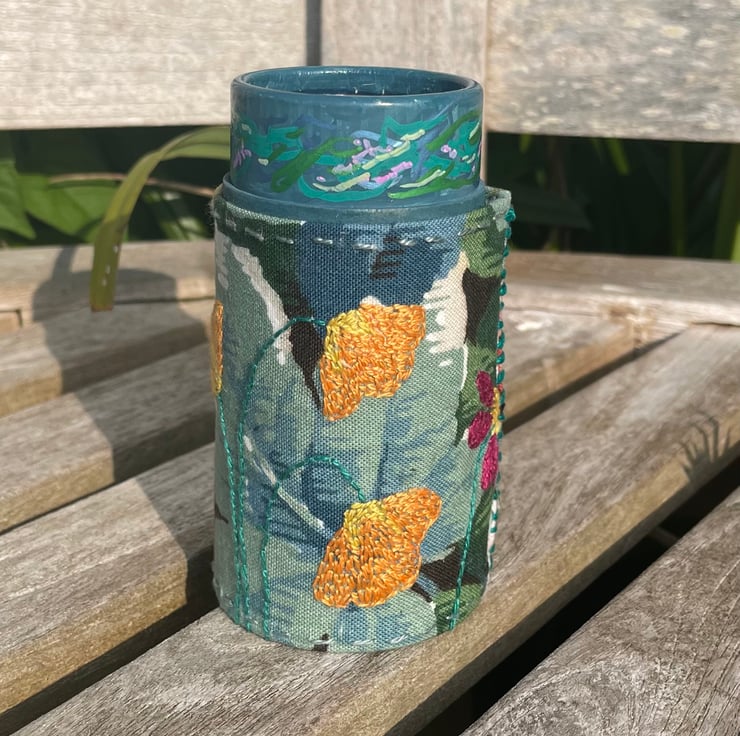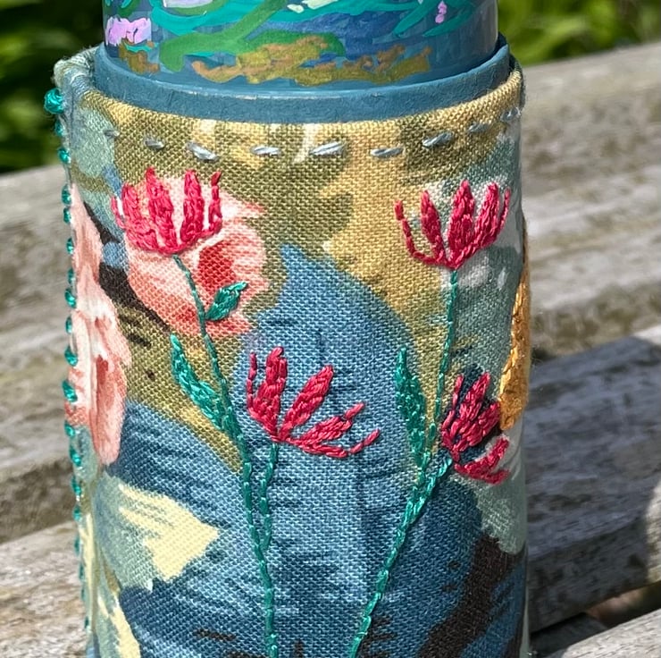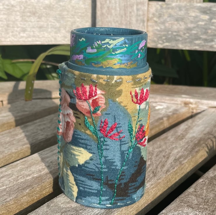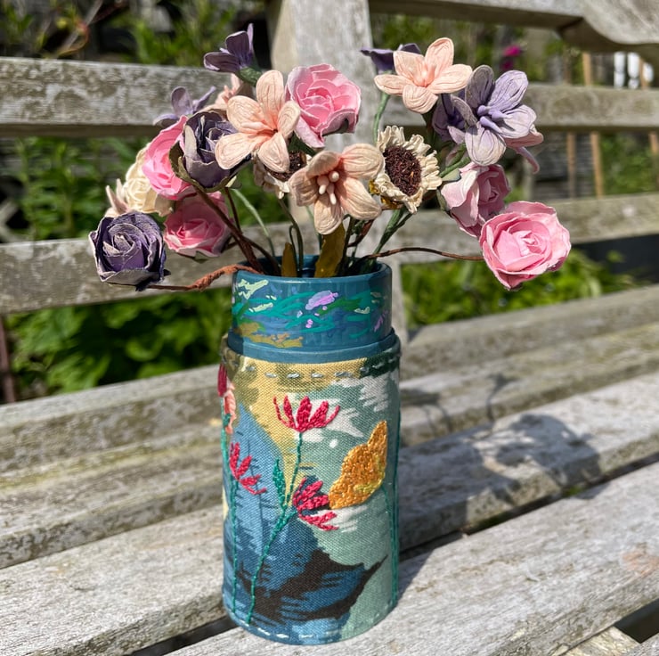 This pretty, versatile canister pot has a cardboard core, covered in a botanical cotton print swatch hand embroidered by me.